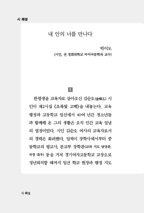 한평생을 교육자로 살아온 김순오 시인은 이 시집에서 자기 자신의 존재감을 찾아 나선 내면의식이 드러난 시 세계를 보여준다.