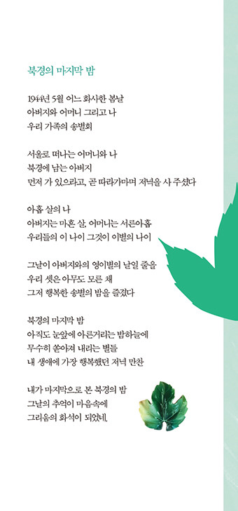 이 시집은 시인뿐만 아닌 우리 산 자들 모두의 인생론에 관한 이야기이다. 생이별의 가족사를 아프게 경험하며 영원한 이별에 대한 상처를 안은 시인은 그 회한의 삶으로써 이별 죽음 등의 짙은 정서와 함께 영적인 새로운 세계를 바라보는 시각을 시 속에 담았다.