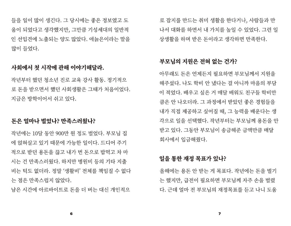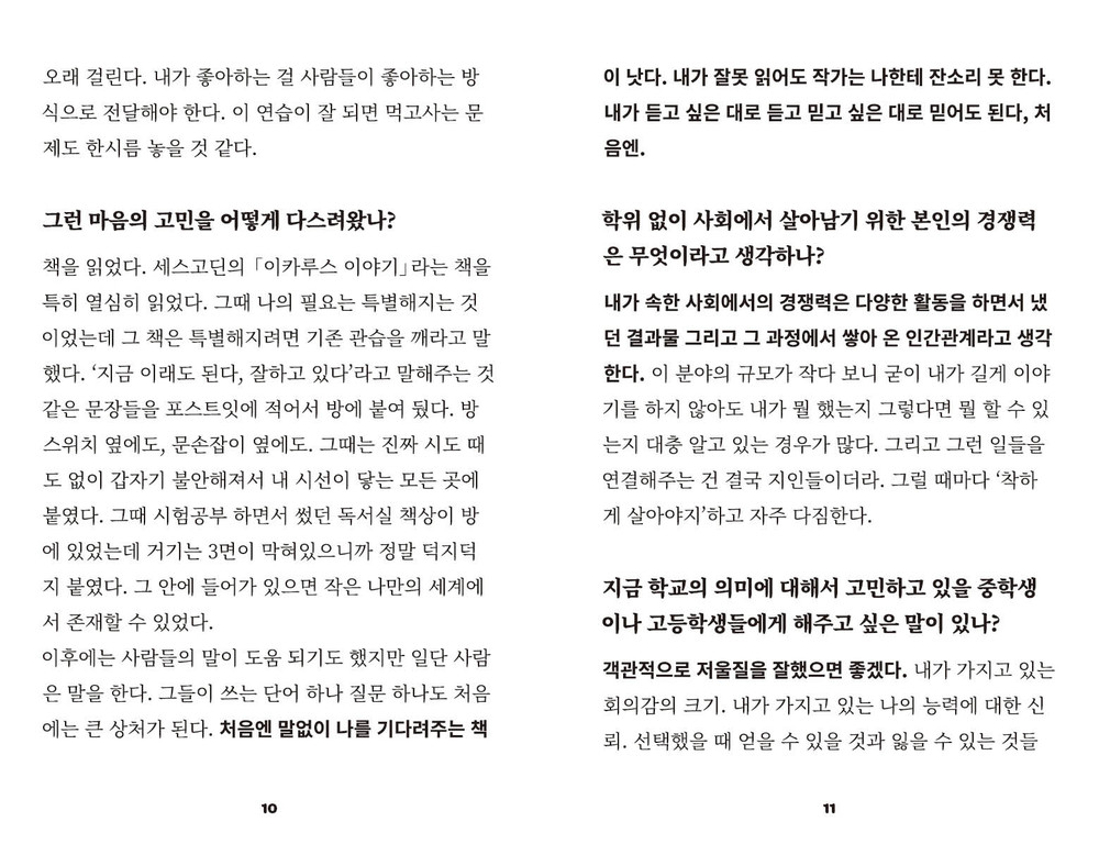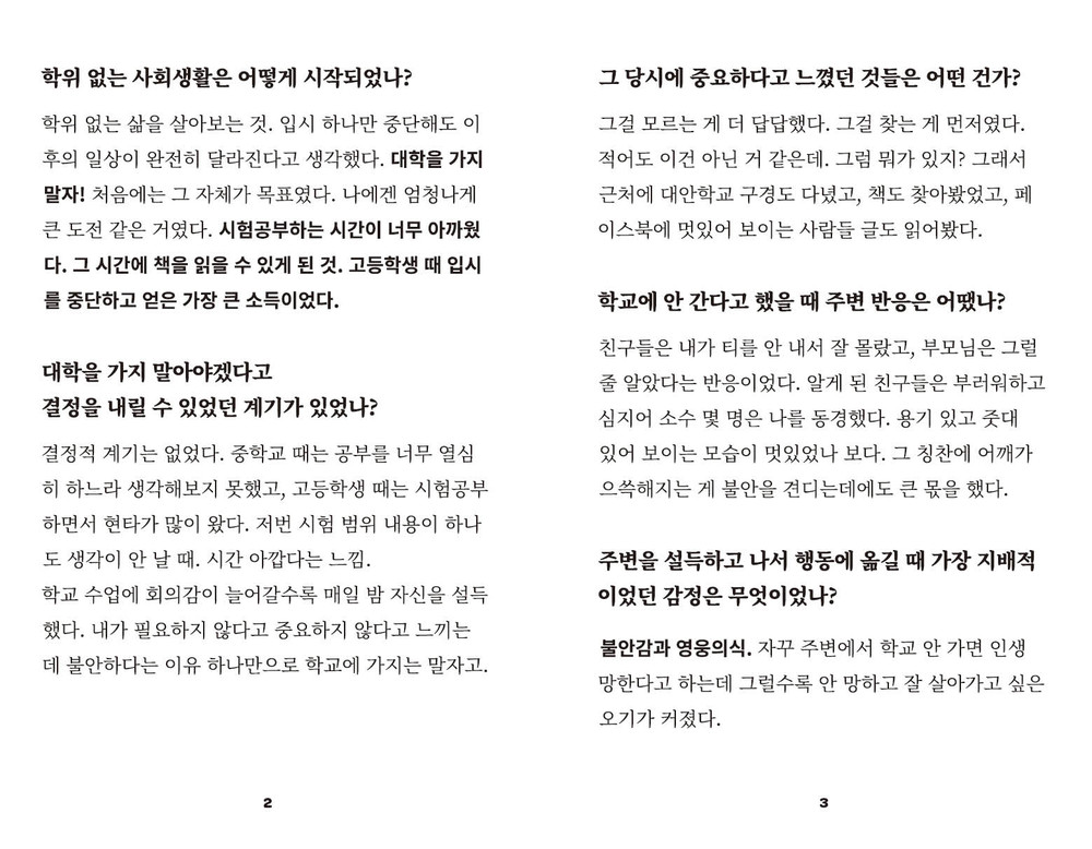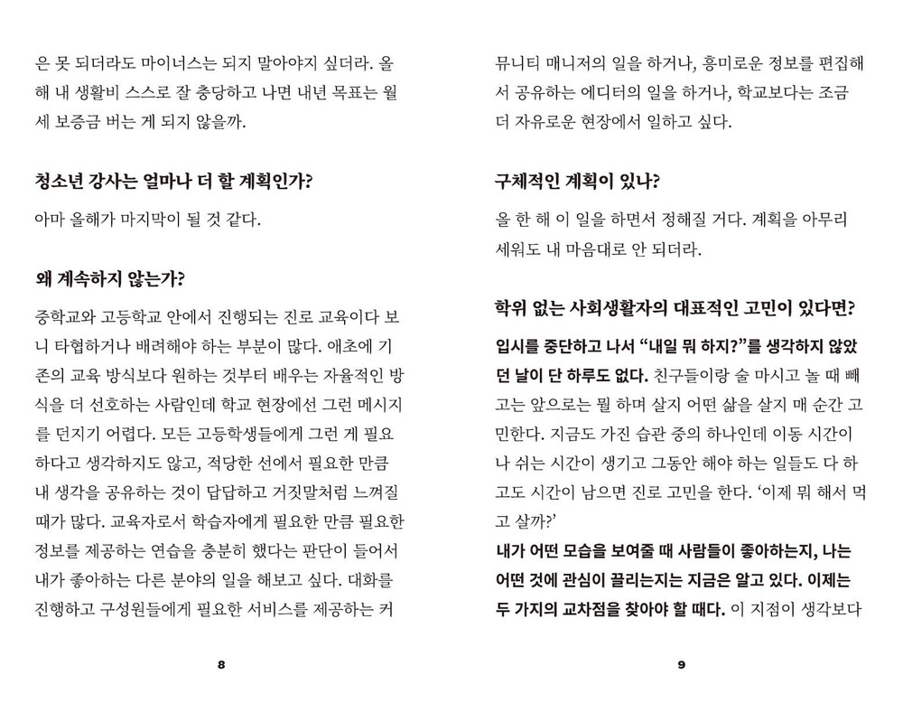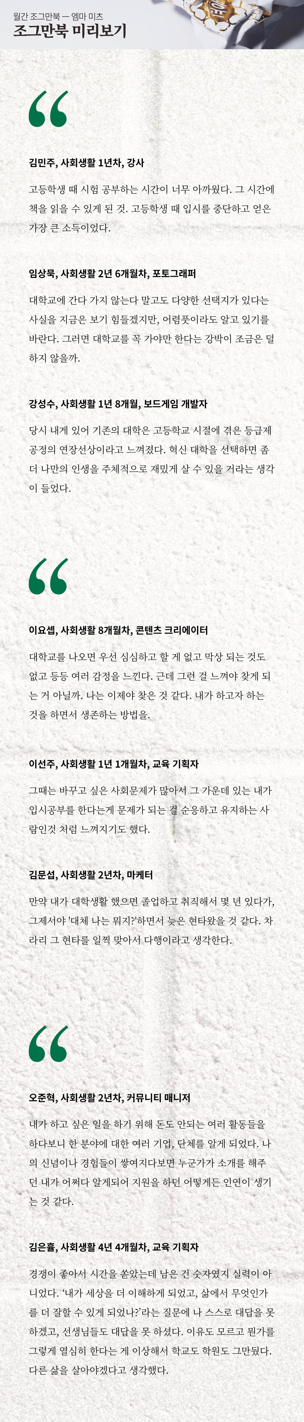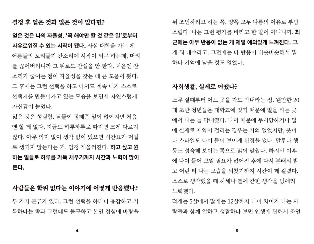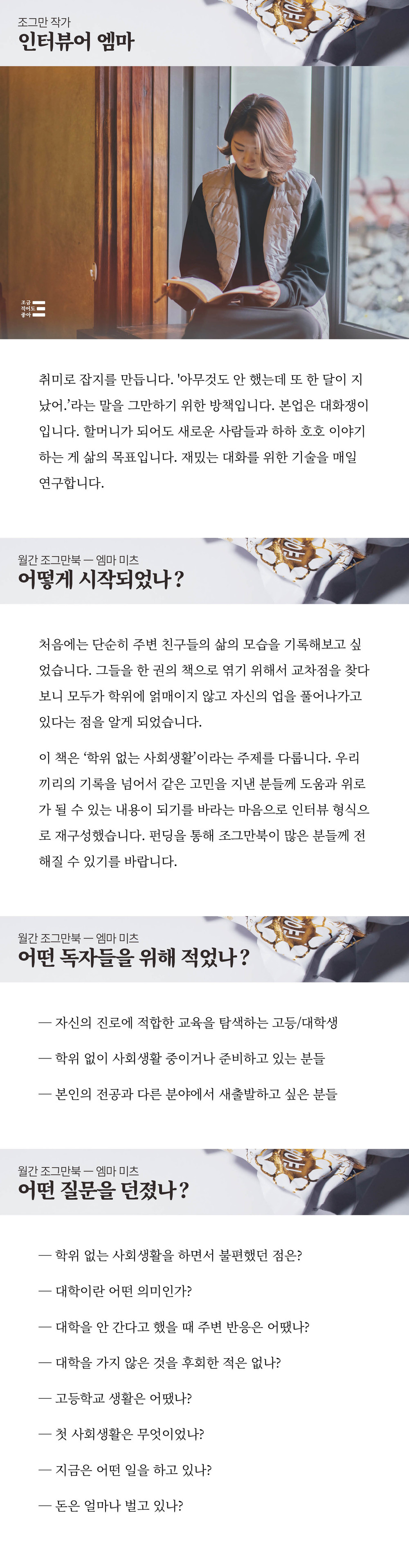 인터뷰어 엠마가 사회생활하는 가장 친한 친구들이 사는 이야기를 담았습니다. 처음에는 단순히 주변 친구들의 삶의 모습을 기록해보고 싶었습니다. 그들을 한 권의 책으로 엮기 위해서 교차점을 찾다보니 모두가 학위에 얽매이지 않고 자신의 업을 풀어나가고 있다는 점을 알게 되었습니다. 이 책은 ‘학위 없는 사회생활’이라는 주제를 다룹니다. 우리끼리의 기록을 넘어서 같은 고민을 지낸 분들께 도움과 위로가 될 수 있는 내용이 되기를 바라는 마음으로 인터뷰 형식으로 재구성했습니다.