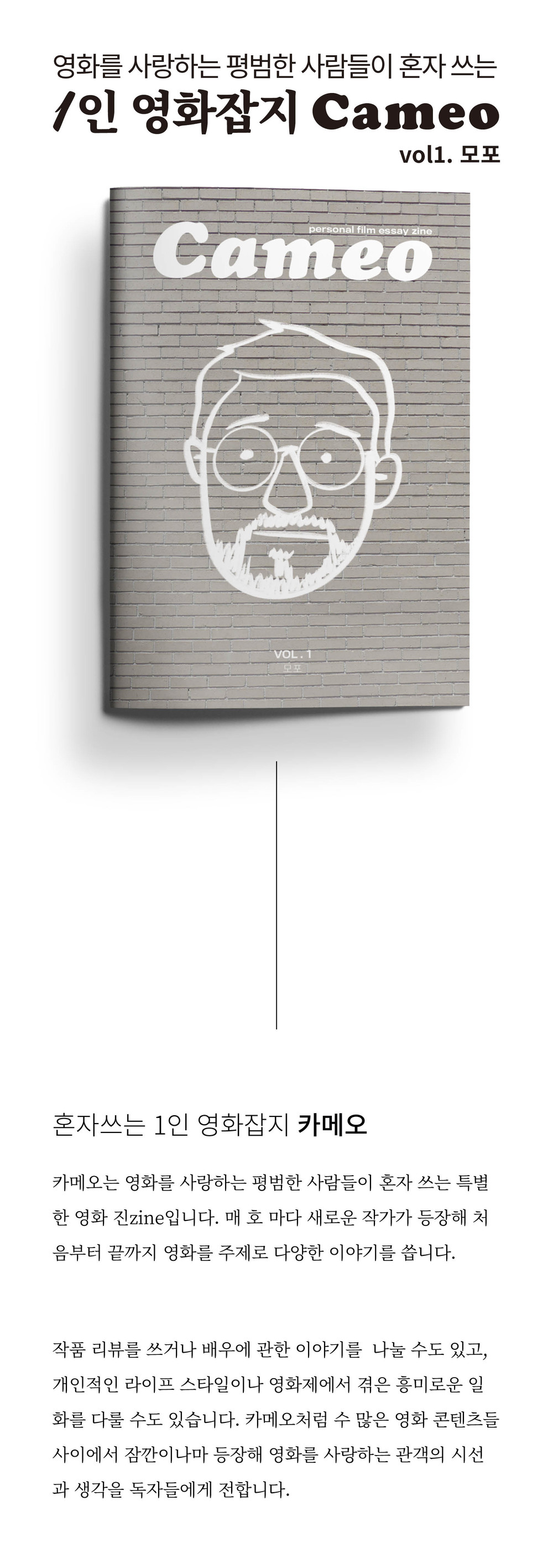 카메오는 영화를 사랑하는 평범한 사람들이 혼자 쓰는 특별한 영화 진zine입니다. 매 호 마다 새로운 작가가 등장해 처음부터 끝까지 영화를 주제로 다양한 이야기를 씁니다.
