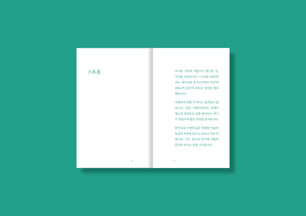 스트롤 00 도시를 거닐며 적었거나 탈고한 글, 사진을 모았습니다. <스트롤> 00호에서는 제주도와 후쿠오카에서 하루에 20km씩 걸으며 떠오른 생각을 정리 했습니다.