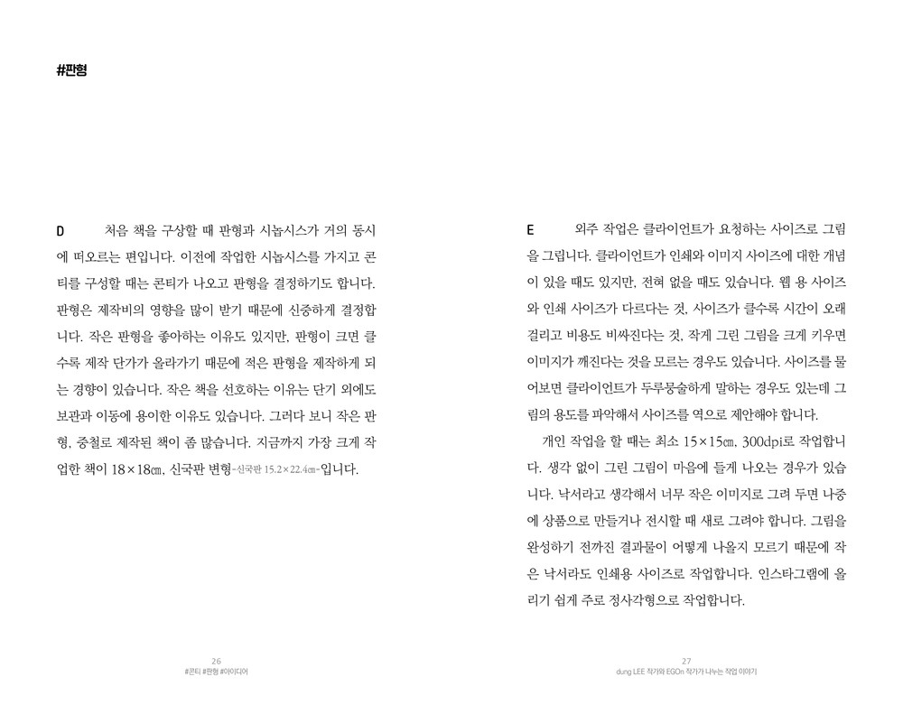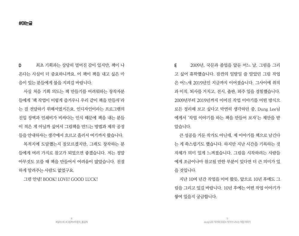디자인 회사와 출판사를 거쳐 독립출판으로 책을 만드는 둥리와 취미로 그리던 그림이 직업이 된 프리랜서 일러스트레이터 이곤의 작업 이야기를 담았습니다.