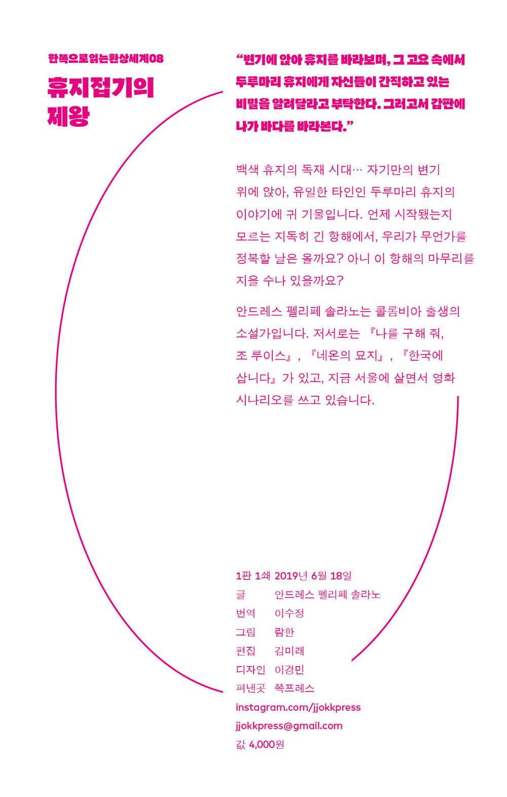 “변기에 앉아 휴지를 바라보며, 그 고요 속에서 두루마리 휴지에게 자신들이 간직하고 있는 비밀을 알려달라고 부탁한다. 그러고서 갑판에 나가 바다를 바라본다.” 백색 휴지의 독재 시대... 자기만의 변기 위에 앉아, 유일한 타인인 두루마리 휴지의 이야기에 귀 기울입니다. 언제 시작됐는지 모르는 지독히 긴 항해에서, 우리가 무언가를 정복할 날은 올까요? 아니 이 항해의 마무리를 지을 수나 있을까요? 안드레스 펠리페 솔라노는 콜롬비아 출생의 소설가입니다. 저서로는 『나를 구해 줘, 조 루이스』, 『네온의 묘지』, 『한국에 삽니다』가 있고, 지금 서울에 살면서 영화 시나리오를 쓰고 있습니다.