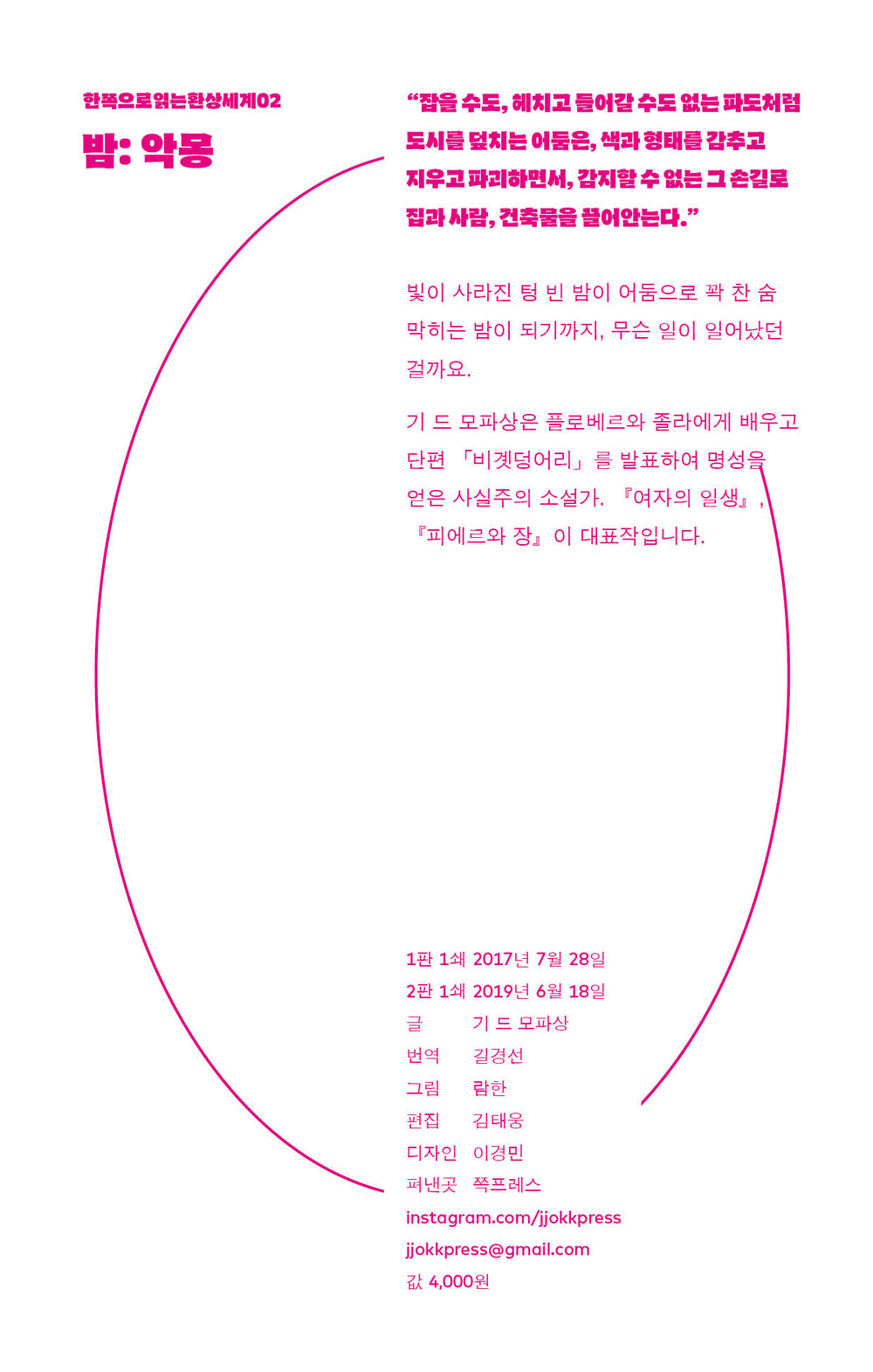 “잡을 수도, 헤치고 들어갈 수도 없는 파도처럼 도시를 덮치는 어둠은, 색과 형태를 감추고 지우고 파괴하면서, 감지할 수 없는 그 손길로 집과 사람, 건축물을 끌어안는다.” 빛이 사라진 텅 빈 밤이 어둠으로 꽉 찬 숨 막히는 밤이 되기까지, 무슨 일이 일어났던 걸까요. 기 드 모파상은 플로베르와 졸라에게 배우고 단편 「비곗덩어리」를 발표하여 명성을 얻은 대표적인 사실주의 소설가로 『여자의 일생』, 『피에르와 장』이 대표작입니다.