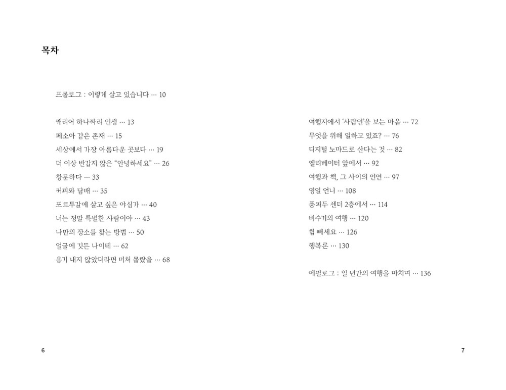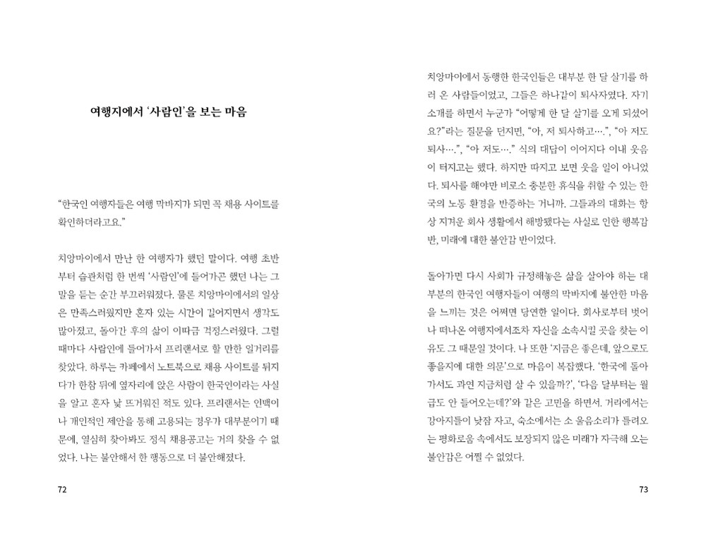 더 이상 회사에 다니지 않겠다는 다짐과 함께 퇴사를 하고 치앙마이 한 달 살기를 떠났습니다. 그 후로 일 년이 흐른 지금, 여전히 그때의 다짐을 지켜내고 있습니다. 지난 한 해는 포르투갈, 크로아티아 등 상상해본 적조차 없던 근무 환경에서 좋아하는 일을 할 수 있었던 꿈같은 시간이었습니다. 살아보는 여행을 하며 얻은 경험, 여행에서 만난 소중한 인연들, 일하며 여행하는 삶에 대한 이야기를 담았습니다.