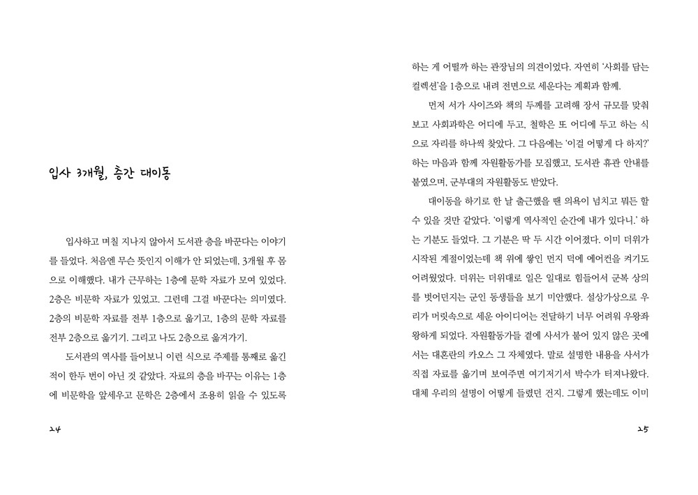 도서관에서 벌어지는 시트콤 같은 재밌는 일상들을 정리하고 싶다고 생각만 하다가 퇴사 결심과 동시에 글을 쓰기 시작해서 출판하게 되었습니다.