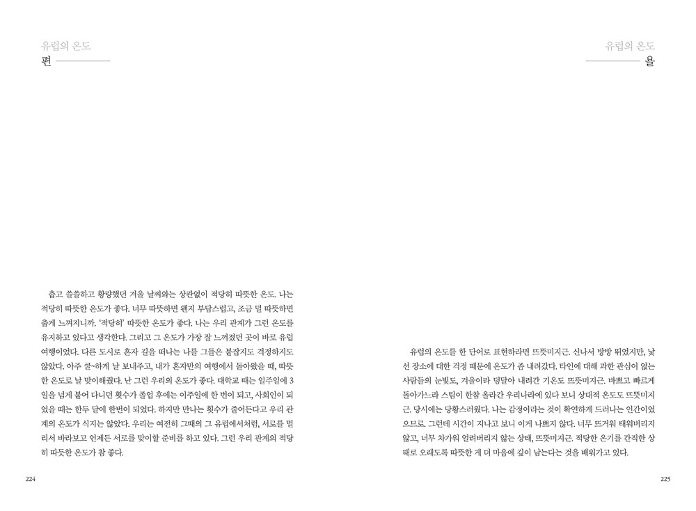 유럽의 온도를 한 단어로 표현하라면 뜨뜻미지근. 너무 뜨거워 태워버리지 않고, 너무 차가워 얼려버리지 않는 상태, 뜨뜻미지근. 적당한 온기를 간직한 상태로 오래도록 따뜻한게 더 마음에 깊이 남는다는 것을 배워가고 있다. - 유럽의 온도 中