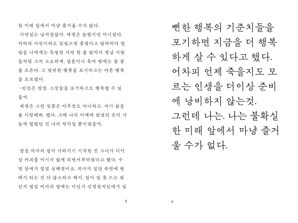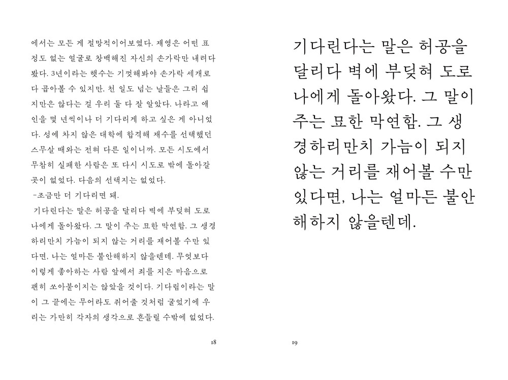 "생각해보면 두려움이라는 단어를 떠올릴 틈조차 없이 두려운 것들이 범람해오는 삶이었다. 무언가를 준비한다는 건, 결국 두려워한다는 말과 같았으니까. 정작 준비할 수 없는 것 앞에서는 나보다 두려움이 더 커서 눈을 감아버리는 게 고작이었다. "