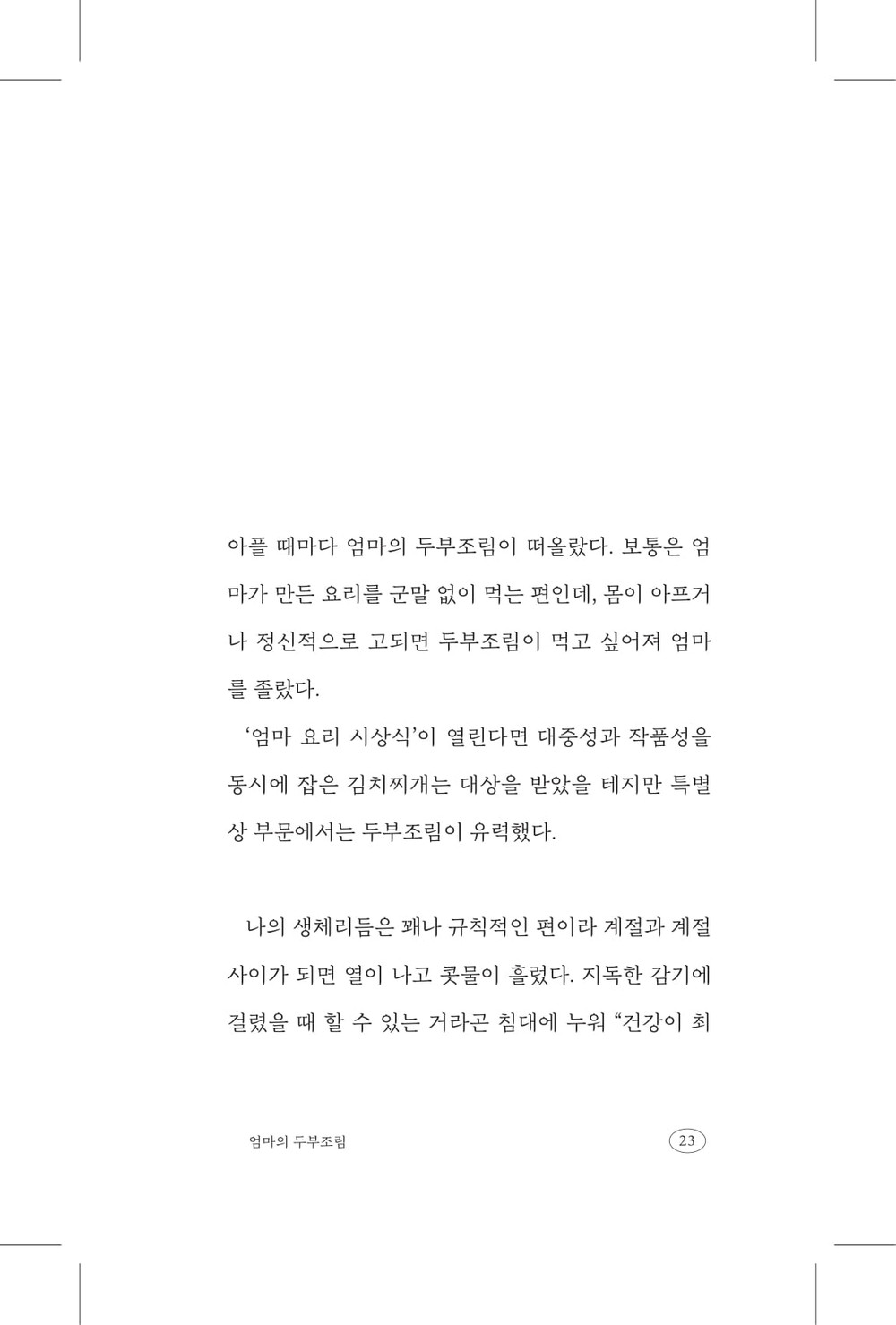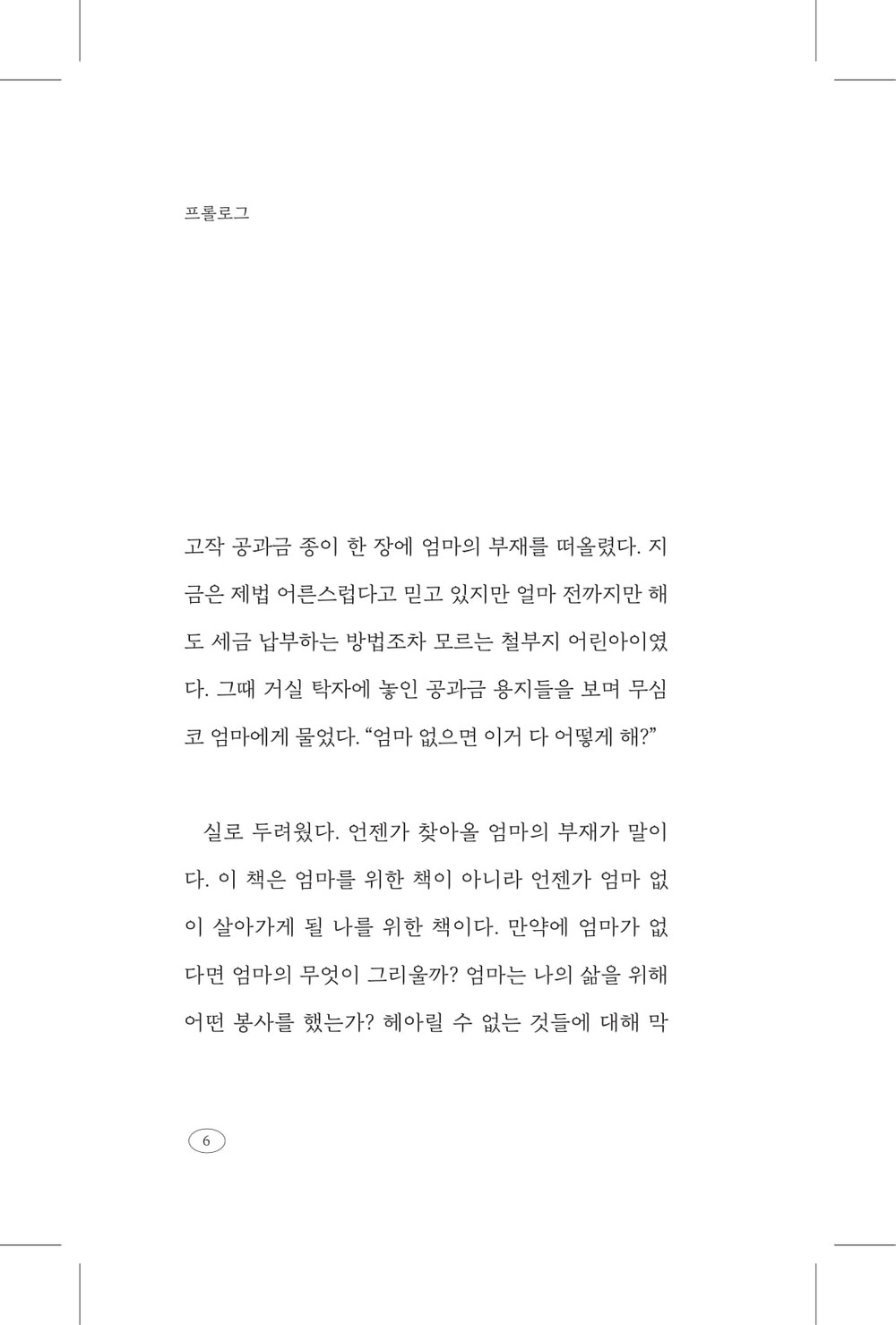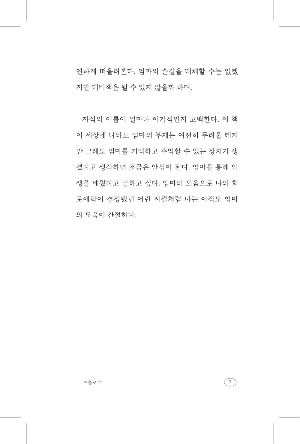 <존재의 부재로 쓰임> 이 책은 ‘언젠가 엄마 없는 삶을 살게 된다면 나는 엄마의 무엇이 그리울까’ ‘엄마는 우리를 위해 어떤 봉사를 하며 살았나’하는 자문(自問)에서 시작된 책으로, 엄마 없는 삶을 위한 대비책입니다. 엄마 요리 레시피와 그 외 다양한 매뉴얼이 담긴 에세이입니다.