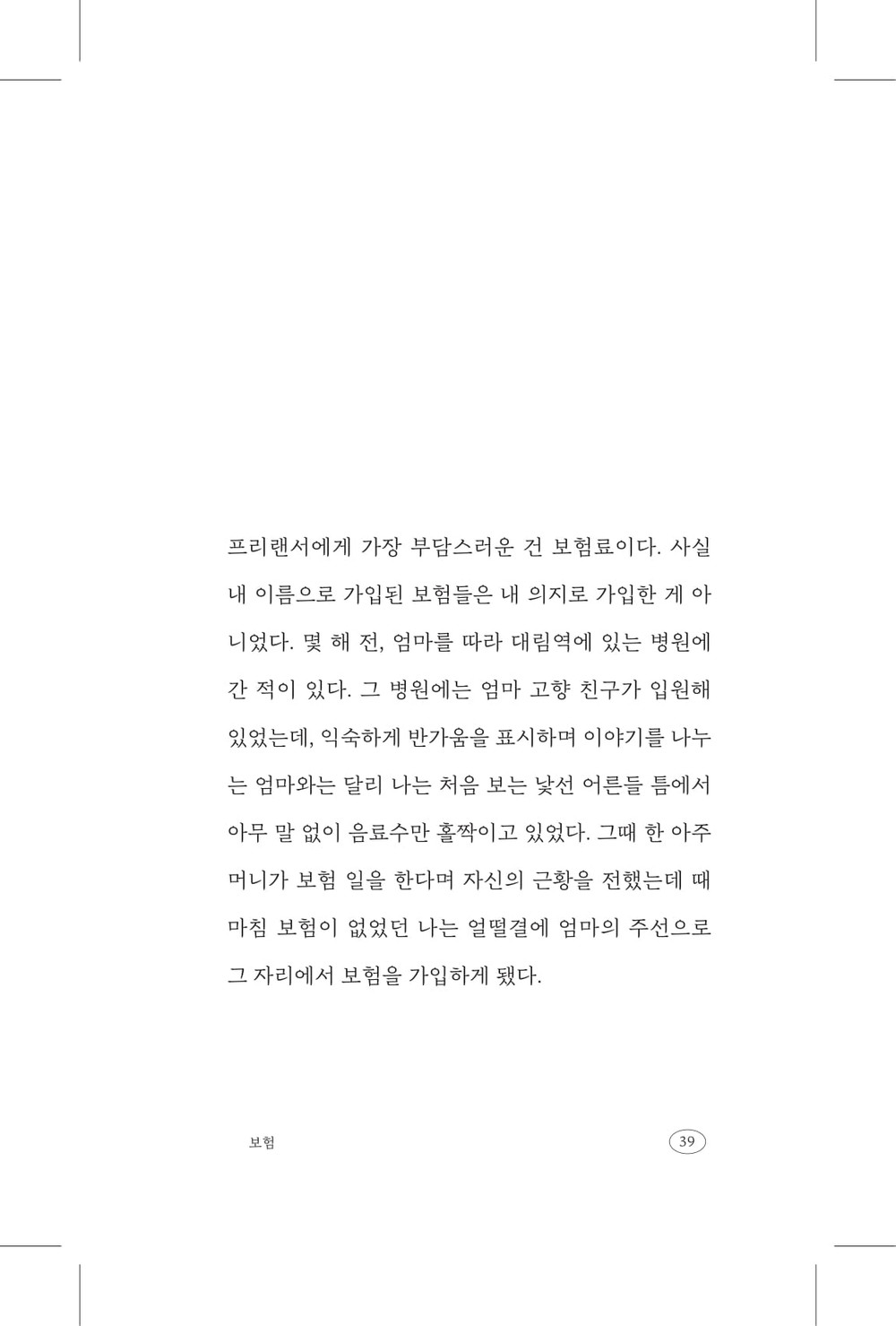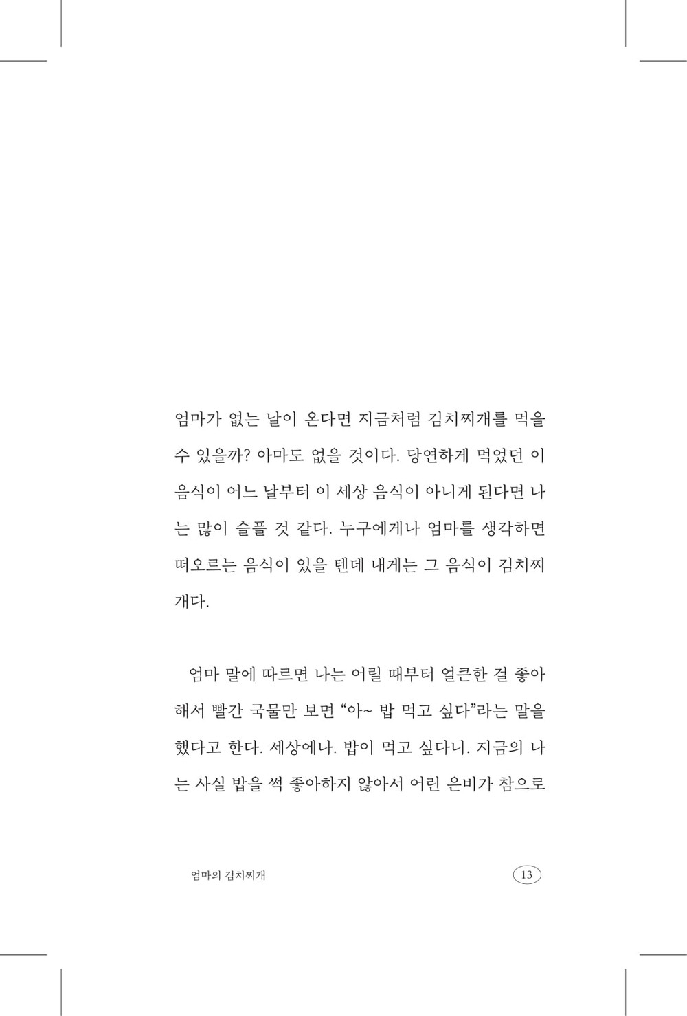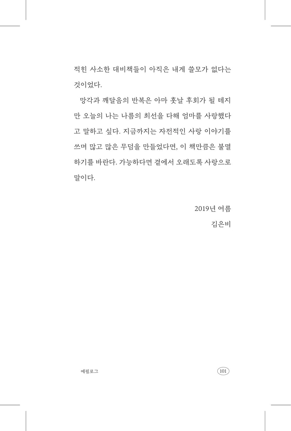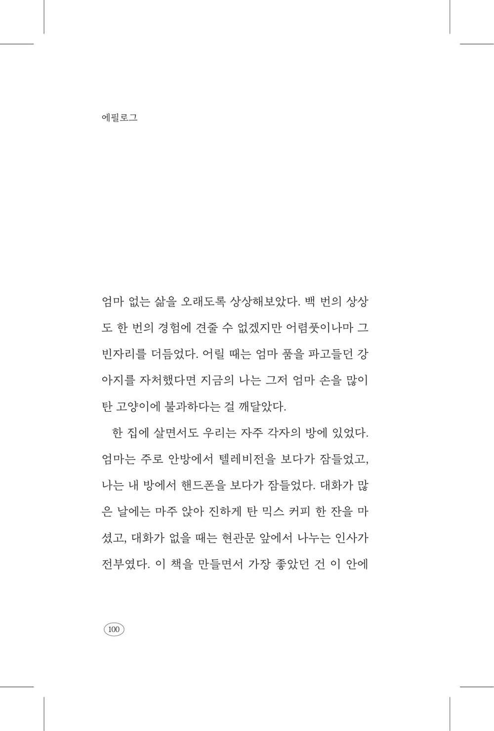 <존재의 부재로 쓰임> 이 책은 ‘언젠가 엄마 없는 삶을 살게 된다면 나는 엄마의 무엇이 그리울까’ ‘엄마는 우리를 위해 어떤 봉사를 하며 살았나’하는 자문(自問)에서 시작된 책으로, 엄마 없는 삶을 위한 대비책입니다. 엄마 요리 레시피와 그 외 다양한 매뉴얼이 담긴 에세이입니다.