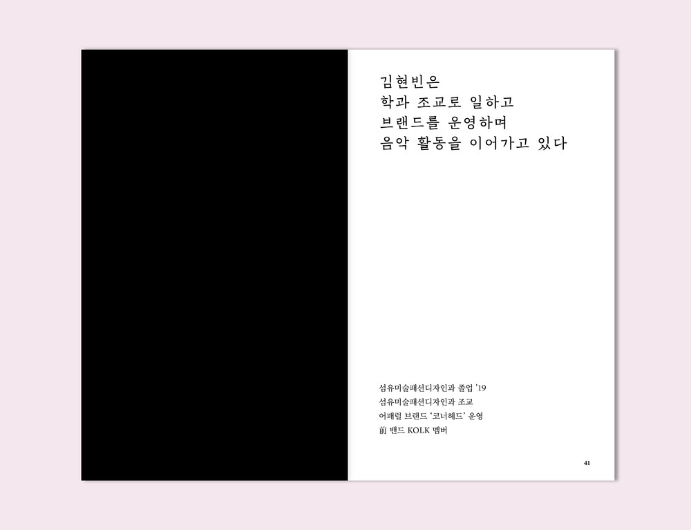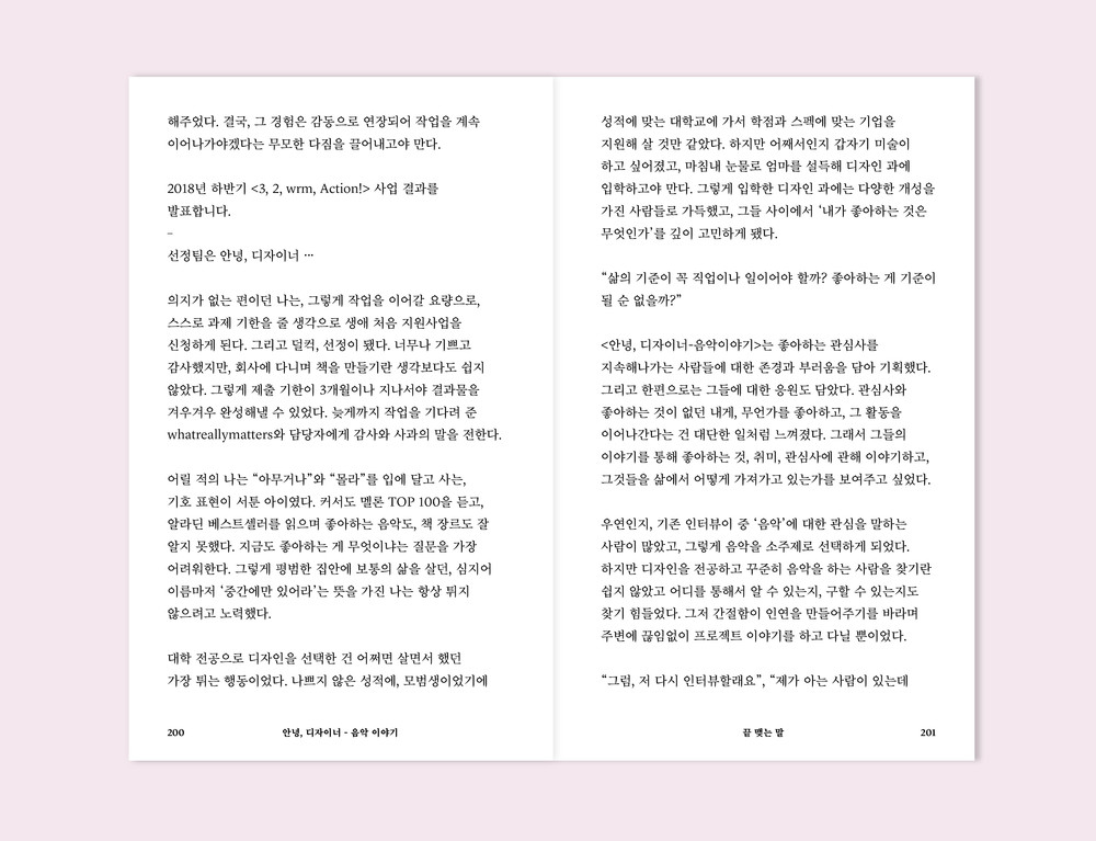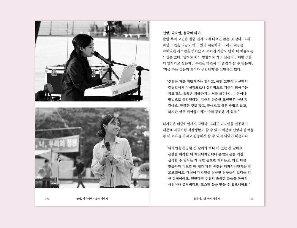 “단지 대학에서 디자인을 전공했다는 이유로 디자이너의 삶을 살 수도 있지만, 그 바탕에 더 근본적인 이유가 있어야 한다고 생각해요. 어떤 디자이너로 살아갈지가 아닌 어떤 사람으로 살아가야 하는지에 대해서요.” “어떤 사람은 꿈을 정해놓고 그걸 향해서 가기도 하고, 목적을 이루거나, 도달하거나, 한 분야에서 훌륭한 어떤 업적을 이룬 사람이 있을 수도 있지만 그건 어쩌면 1% 정도의 사람이 아닐까요? 대부분은 계속해서 각자의 길을 가는 중인 것 같아요.” “한번 사는 인생, 마음의 소리에 따라 살면 좋겠어요. 어떤 걸 할지 정했다면 고민만 하기보다는 일단 시작하고요. 일단 시작하고, 부딪히다 보면 다음 스텝이 나올 수 있거든요. 어떤 일을 하던 한가지 답은 없어요. 부딪히며 답을 찾는 걸 추천해요.”