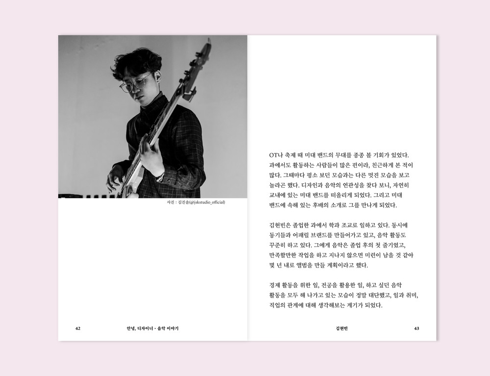 디자인을 전공하면 모두 디자이너가 되어야 할까? 안녕, 디자이너는 디자인을 전공한 다양한 사람들의 고민을 들어보고 기록한다. 그 기록을 통해 전공과 직업, 일 그리고 꿈에 대해 이야기한다. 안녕, 디자이너 - 음악 이야기는 디자인을 전공한 다양한 사람들의 이야기 중 음악과 관련된 이야기를 모은 책이다. 음악을 좋아하는 사람, 음악을 취미로 하는 사람, 음악을 하고 싶은 사람, 음악과 관련된 일을 하는 사람들의 이야기를 통해 일과 직업, 관심사와 취미에 관한 이야기를 엿볼 수 있을 것이다.
