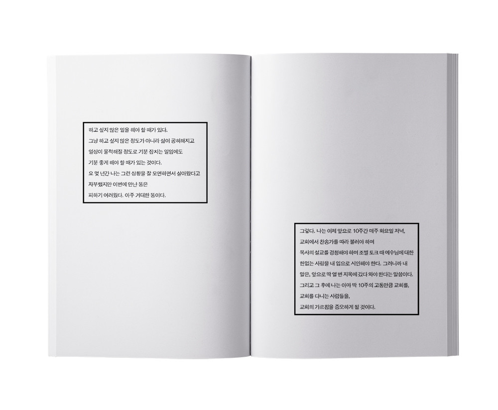 나는 매주 닥쳐올 재앙을 걱정하고 그 재앙이 지난간 뒤에는 재앙이 미친 고통을 곱씹으며 또 다른 고통을 겪는 감정소모를 택하는 대신, 그저 매주 교회로 출발하는 오후 5시부터 집에 도착하는 밤 11시까지 정확히 6시간을 내 일주일에서 도려낸다는 생각으로, 즉 이 고통에 대해 아무런 의미를 부여하지 않는 방식으로 10주를 견디기로 했다.