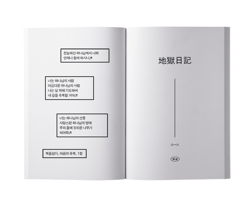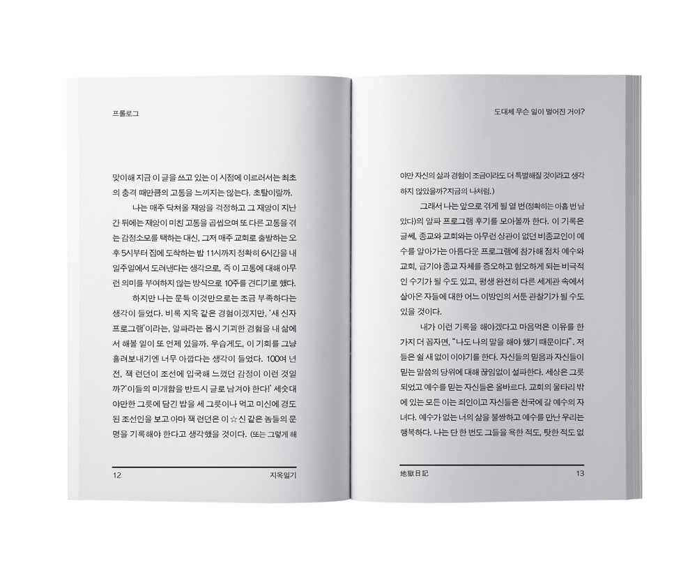 이모의 전도로 어머니와 함께 10주간 ‘새 신자 교육 프로그램’에 참여하게 된 필자가 교회에서 보고 듣고 느낀 것을 기록한 일기입니다. 그는 작은 볼펜과 수첩을 주머니에 넣고 다니며 10주 동안 교회 안에서의 모든 순간을 수첩이 너덜너덜해질 때까지 기록하고 또 기록했습니다. 고민과 분노, 호기심과 웃음, 지루함과 불가해함을 종이에 꾹꾹 담으며 시간을 견딘 그를 보며 신자들은 그윽하게 미소를 지었습니다. 과연, 무의미한 시간을 유의미한 것으로 바꾸고자 분투한 그의 시도는 성공했을까요? 다행히 그는 10주를 무사히 ‘통과’했고, 지금 그의 집에는 ‘새 신자 교육 프로그램’ 수료증이 당당히 놓여 있습니다. 교회에 다녀온 그는 죽지도 않았고 그렇다고 부활하지도 않았죠. 그저 괴상한 기록물을 하나 남겼을 뿐입니다. 그러니 여러분께서는 그저 이 책을 30대 찌질한 아들이 자신의 어머니와 10주간 동행한 ‘믿음 없는 교회 탐방 후기’ 정도로 가볍게 읽으셔도 퍽 재미있으리라 생각됩니다. 그나저나, 당신의 지옥은 어디인가요?