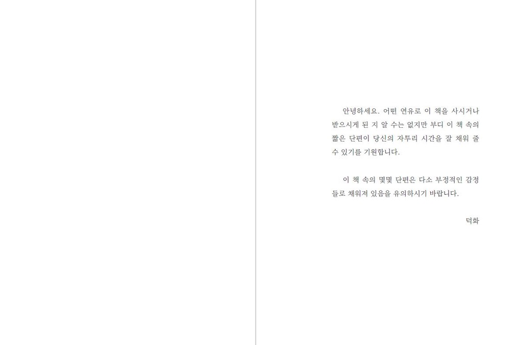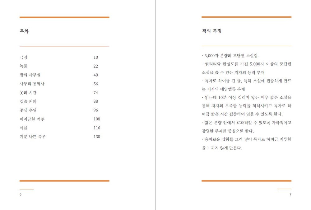 편당 평균 5,000자 분량의 초단편소설 10편으로 구성되어 등교길, 출퇴근길, 잠들기전 짬짬이 시간을 알차게 채워줄 단편집입니다. 작가가 직접 그린 아기자기한 삽화들과 짧은 분량이지만 강렬하고 자극적인 소재들의 단편소설은 독자로 하여금 지루함을 느끼지 않도록 도와줄 것입니다.