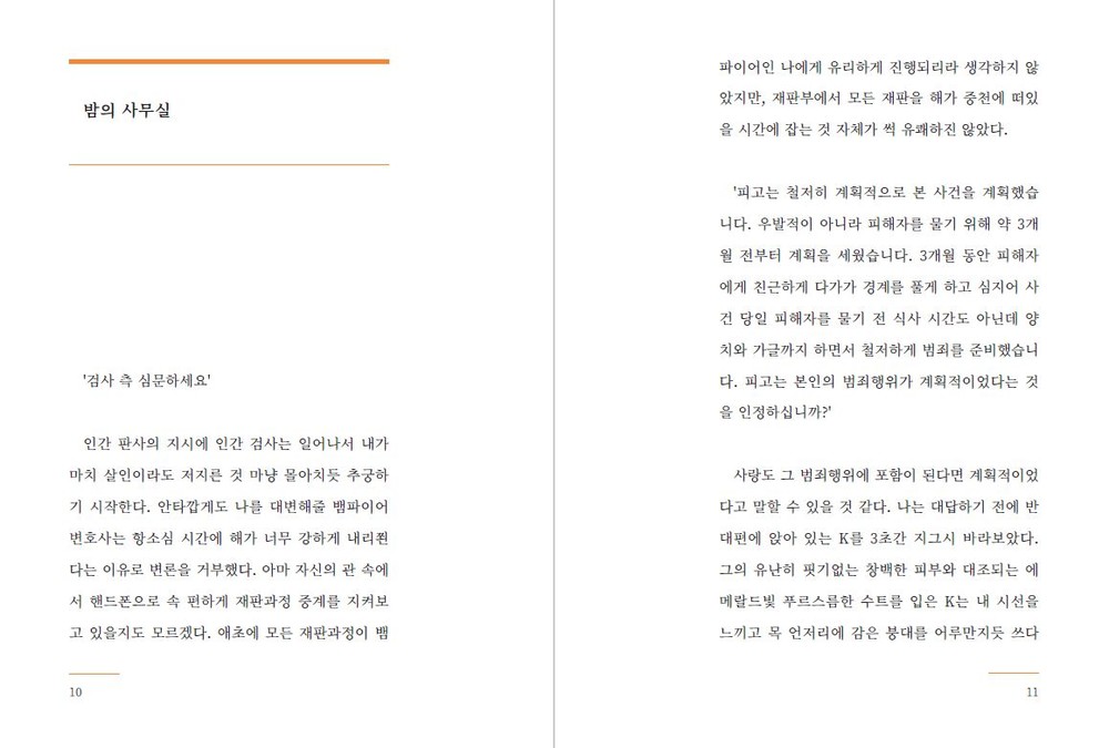 인간 판사의 지시에 인간 검사는 일어나서 내가 마치 살인이라도 저지른 것 마냥 몰아치듯 추궁하기 시작한다. 안타깝게도 나를 대변해줄 뱀파이어 변호사는 항소심 시간에 해가 너무 강하게 내리쬔다는 이유로 변론을 거부했다. 아마 자신의 관 속에서 핸드폰으로 속 편하게 재판과정 중계를 지켜보고 있을지도 모르겠다. 애초에 모든 재판과정이 뱀파이어인 나에게 유리하게 진행되리라 생각하지 않았지만, 재판부에서 모든 재판을 해가 중천에 떠있을 시간에 잡는 것 자체가 썩 유쾌하진 않았다.