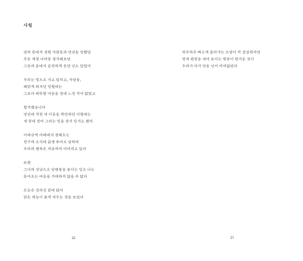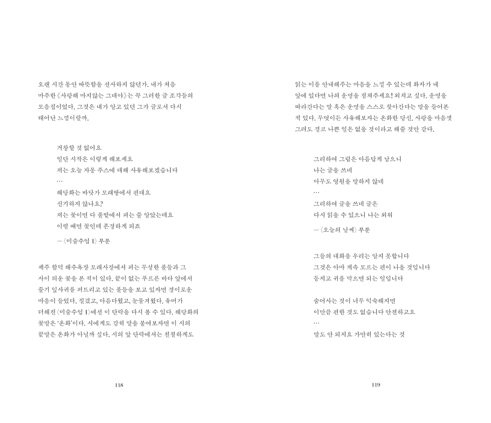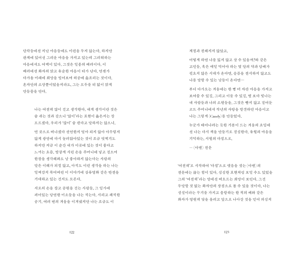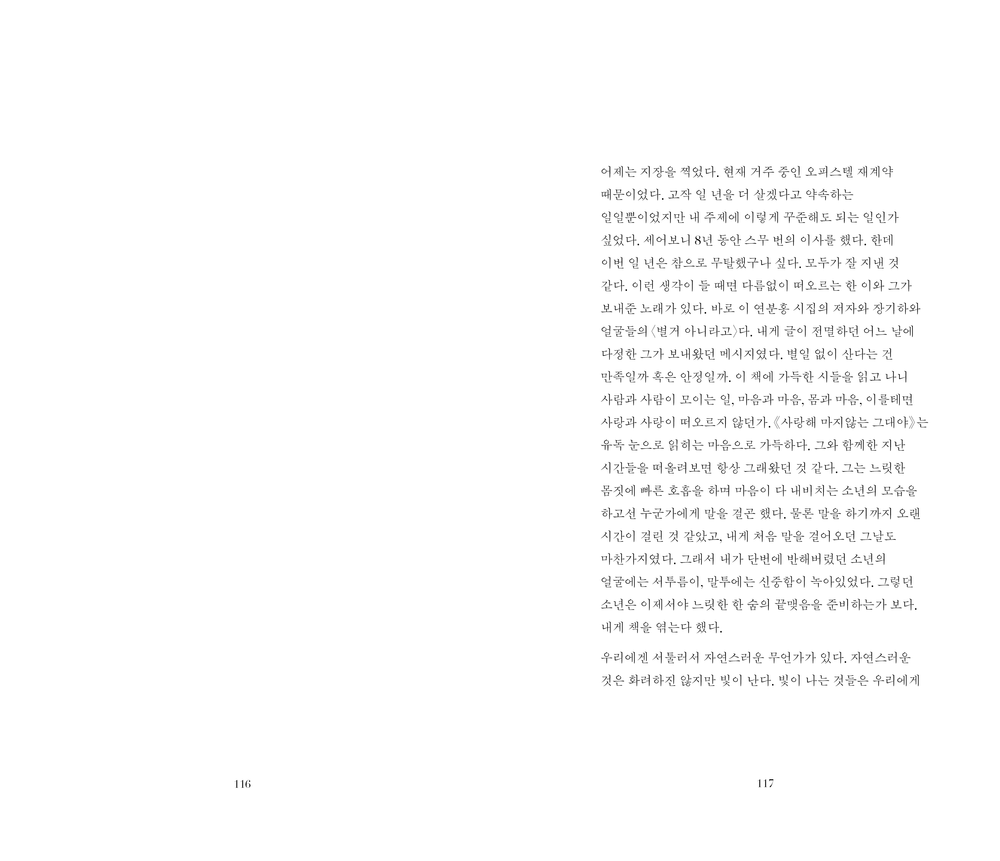 우리는 우리도 모르는 새에 한 발자국 먼 곳으로 나아 온 것 같다. 내게 이런 시기가 오면 나는 가만히 내게 오는 말들을 들어본다. 그리고 앞으로는 그의 글도 함께 찾게 되겠다. 그지없이 평범한 사랑을 하는 내가 그의 글을 읽고 더욱 근사해진 사랑을 비밀스럽고 자랑스레 품게 되는 일. 앞으로 사는 동안 영원토록 사랑을 나눌 수 있겠다는 일. 이 모두 감사한 일이다. 둘러보니 감사하지 않은 일이 없다.