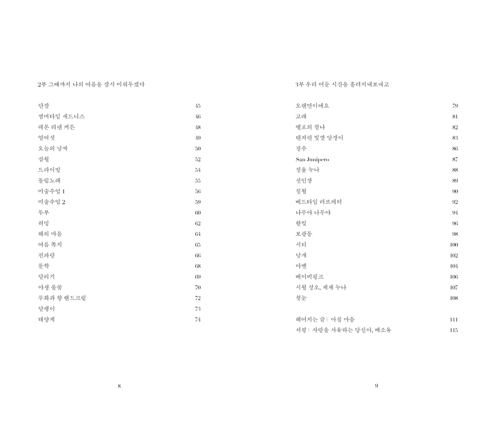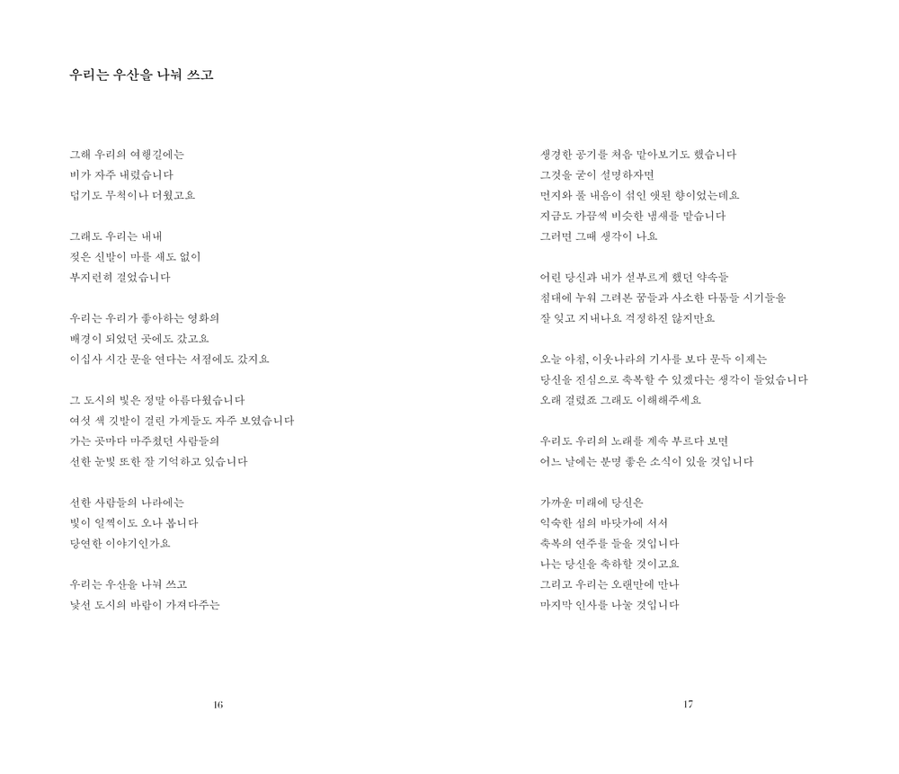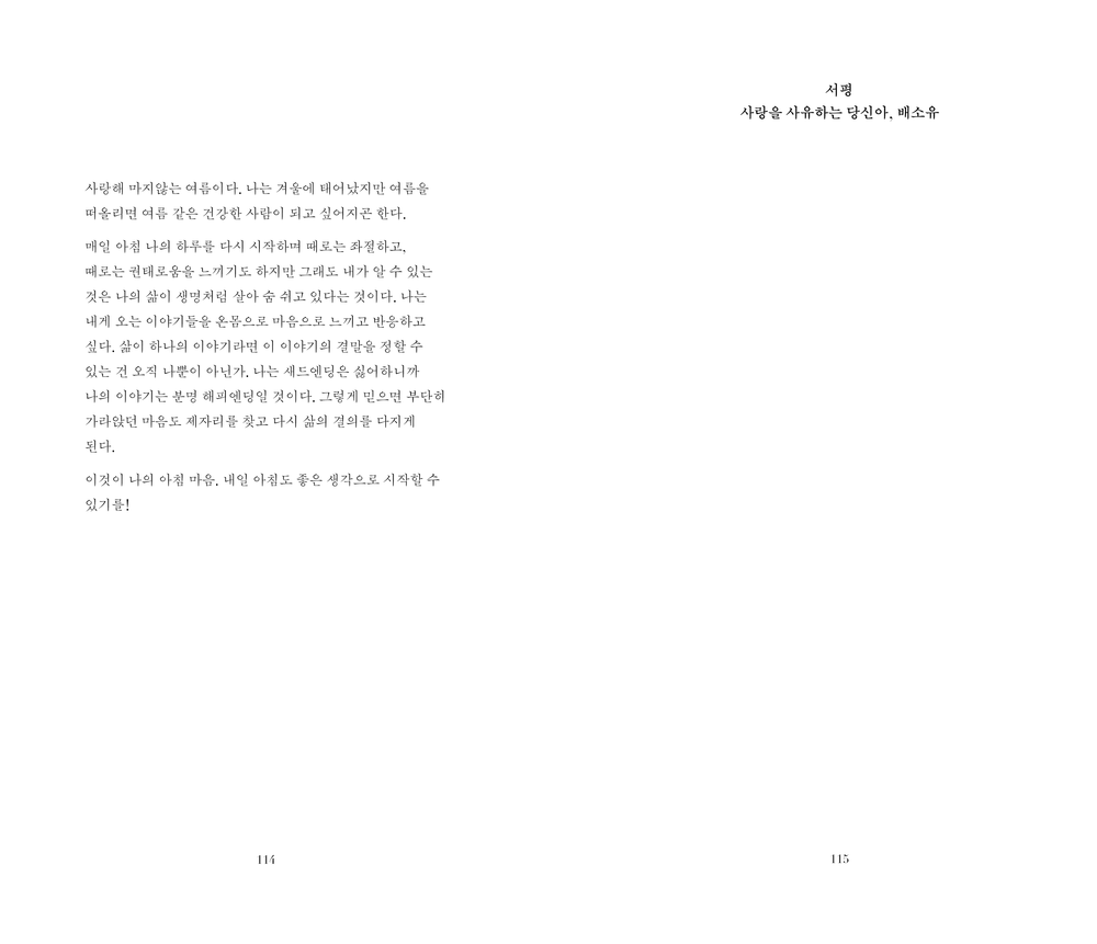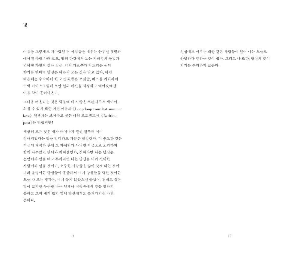 우리는 우리도 모르는 새에 한 발자국 먼 곳으로 나아 온 것 같다. 내게 이런 시기가 오면 나는 가만히 내게 오는 말들을 들어본다. 그리고 앞으로는 그의 글도 함께 찾게 되겠다. 그지없이 평범한 사랑을 하는 내가 그의 글을 읽고 더욱 근사해진 사랑을 비밀스럽고 자랑스레 품게 되는 일. 앞으로 사는 동안 영원토록 사랑을 나눌 수 있겠다는 일. 이 모두 감사한 일이다. 둘러보니 감사하지 않은 일이 없다.