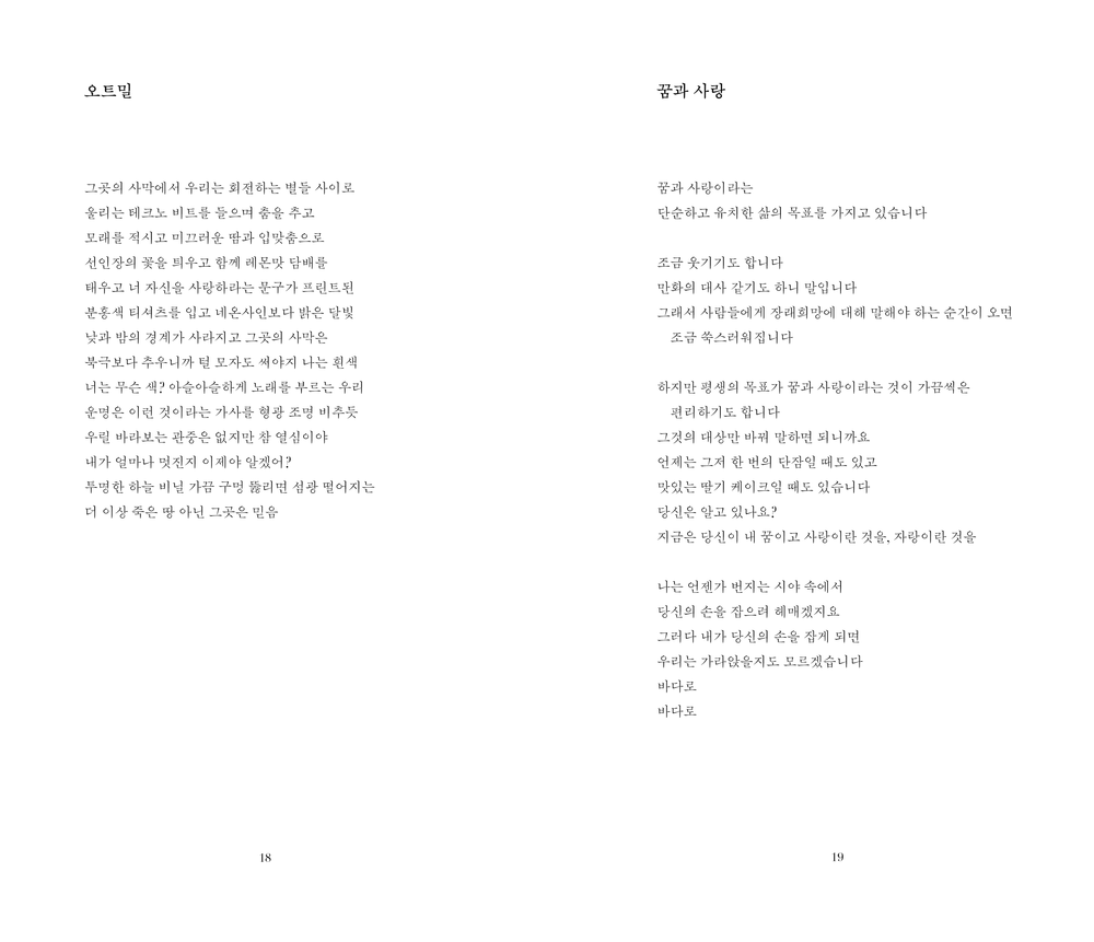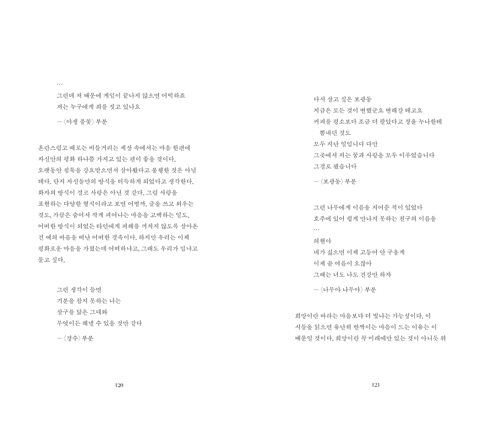 혼란스럽고 때로는 비틀거리는 세상 속에서는 마음 한편에 자신만의 평화 하나쯤 가지고 있는 편이 좋을 것이다. 오랫동안 침묵을 강요받으면서 살아왔다고 불행한 것은 아닐 테다. 단지 자신들만의 방식을 터득하게 되었다고 생각한다. 화자의 방식이 결코 사랑은 아닌 것 같다. 그럼 사랑을 표현하는 다양한 형식이라고 보면 어떨까. 글을 쓰고 외우는 것도, 가끔은 숨어서 작게 피어나는 마음을 고백하는 일도. 어떠한 방식이 되든 타인에게 피해를 끼치지 않도록 살아온 건 예의 바름을 떠난 어떠한 결속이다. 하지만 우리는 이제 평화로운 마음을 가졌는데 어떠하냐고, 그래도 우리가 밉냐고 묻고 싶다.