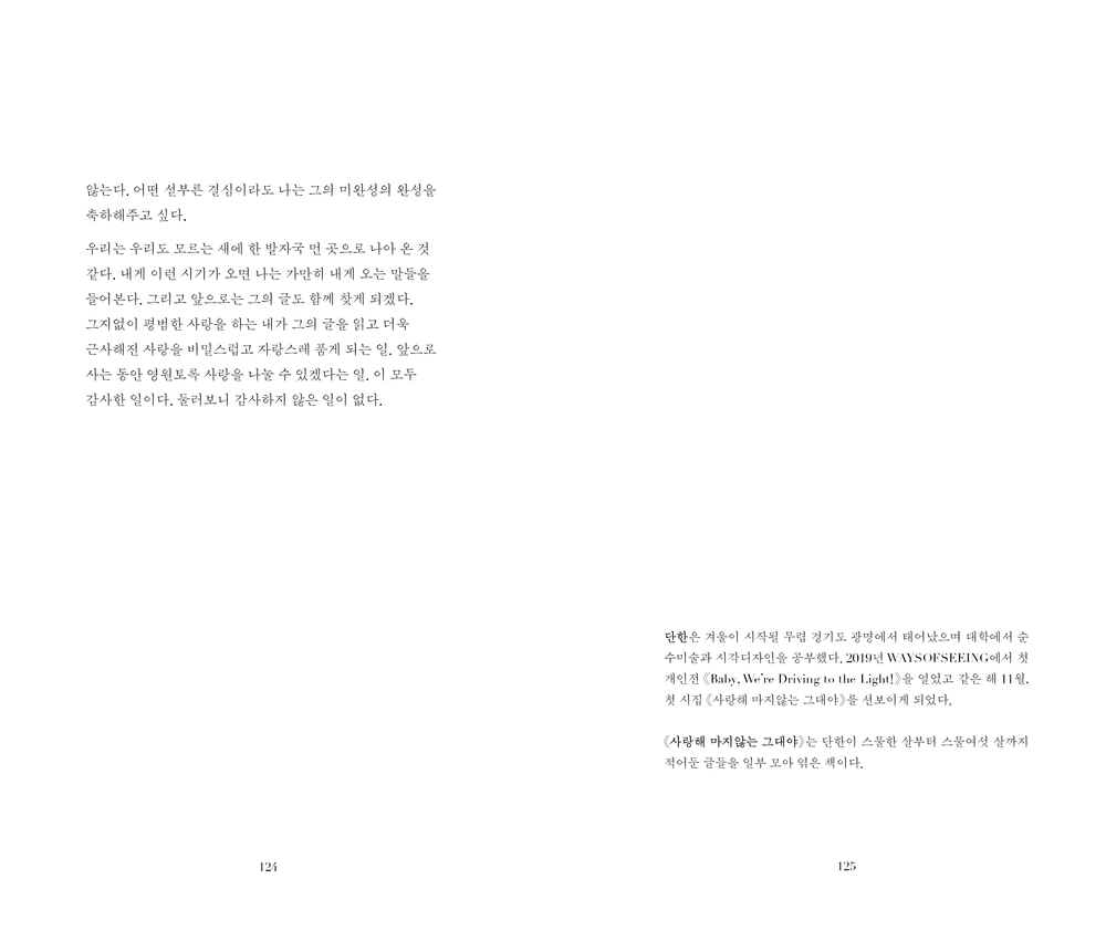 <사랑해 마지않는 그대야>는 단한이 스물한 살부터 스물여섯 살까지 적어둔 글들을 일부 모아 엮은 시집이다.