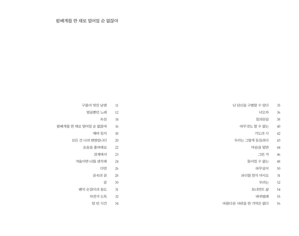 <팔베개를 한 채로 멀어질 순 없잖아>는 43편의 시가 담긴 시집입니다.