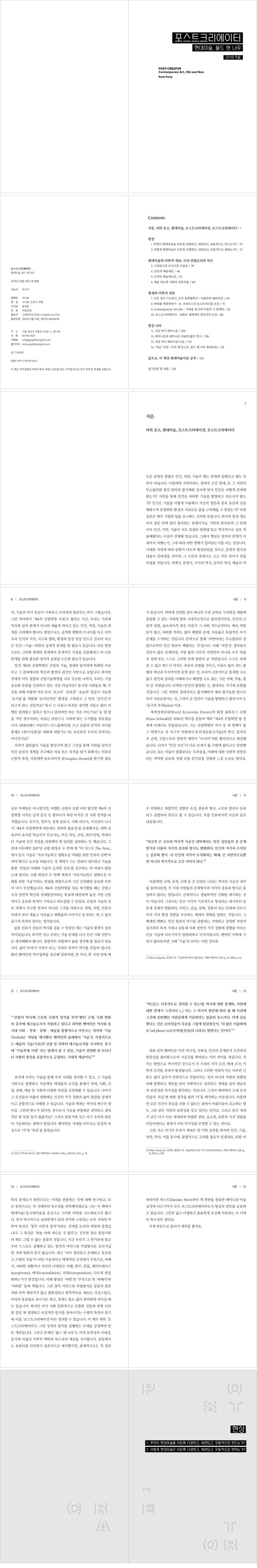 저자는 현대미술이 점점 더 가볍게 소비되는 딜레마를 포착하지만 이미 존재하고 있었던 것들이 특정한 기술 매체적 조건에서 어떠한 상황이나 사건의 디테일로 이행, 변주, 편집, 배치되면서 다르게 현실화하고 있는지를 보아야한다고 한다. 예전과 달리 불확실하고 변칙적이며 경계 없이 이루어지는 현재의 예술 생산과 소비 생태계의 감각 지각적 논리를 인정하고 있다. 이에 저자는 사회 문화적으로 산출된 것에 의지하면서도 생경하고 이질적인 대상을 찾아나가는 이들의 수행적 특징을 포착하여 ‘포스트크리에이터’로 정의한다. 이에 동시대의 강력한 플랫폼인 유튜브의 감각지각논리와 관심경제에 대해 살피면서 지금의 창의성의 개념에 대해서도 짚어본다.