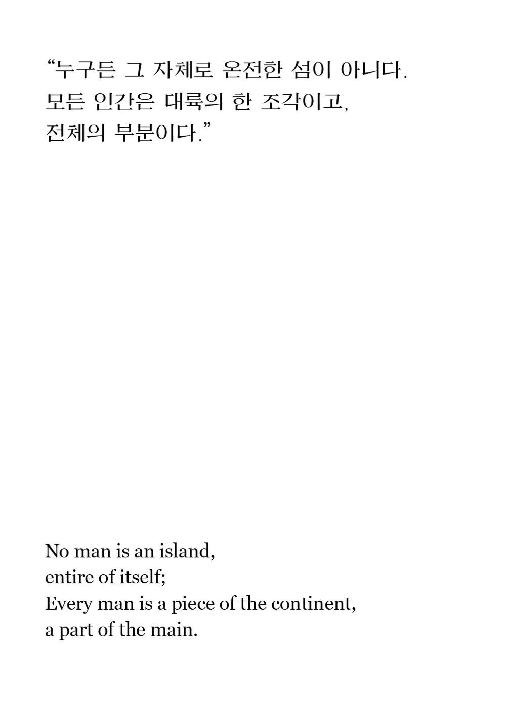 “누구든 그 자체로 온전한 섬이 아니다. 모든 인간은 대륙의 한 조각이고 전체의 부분이다(No man is an island, entire of itself; Every man is a piece of the continent, a part of the main.)” 존 던(John Donne)의 유명한 문장, 누구를 위하여 종이 울리나(For Whom The Bell Tolls)의 첫 구절을 생각합니다. 세상에 혼자 남겨진 것처럼 쓸쓸할 때 꺼내어 읊조리면 금세 마음이 따뜻해지는 문장입니다. 바다 위에 외떨어진 듯한 하나의 고유한 섬들이 사실 그 아래로는 모두 연결돼 있다는 것이 놀랄 일은 아니죠. 사람도 그렇습니다. 혼자서 존재하는 이 놀랍도록 독립적이고 신비로운 생명체는 결국은 가족, 친구, 동료와 연결돼 있습니다.