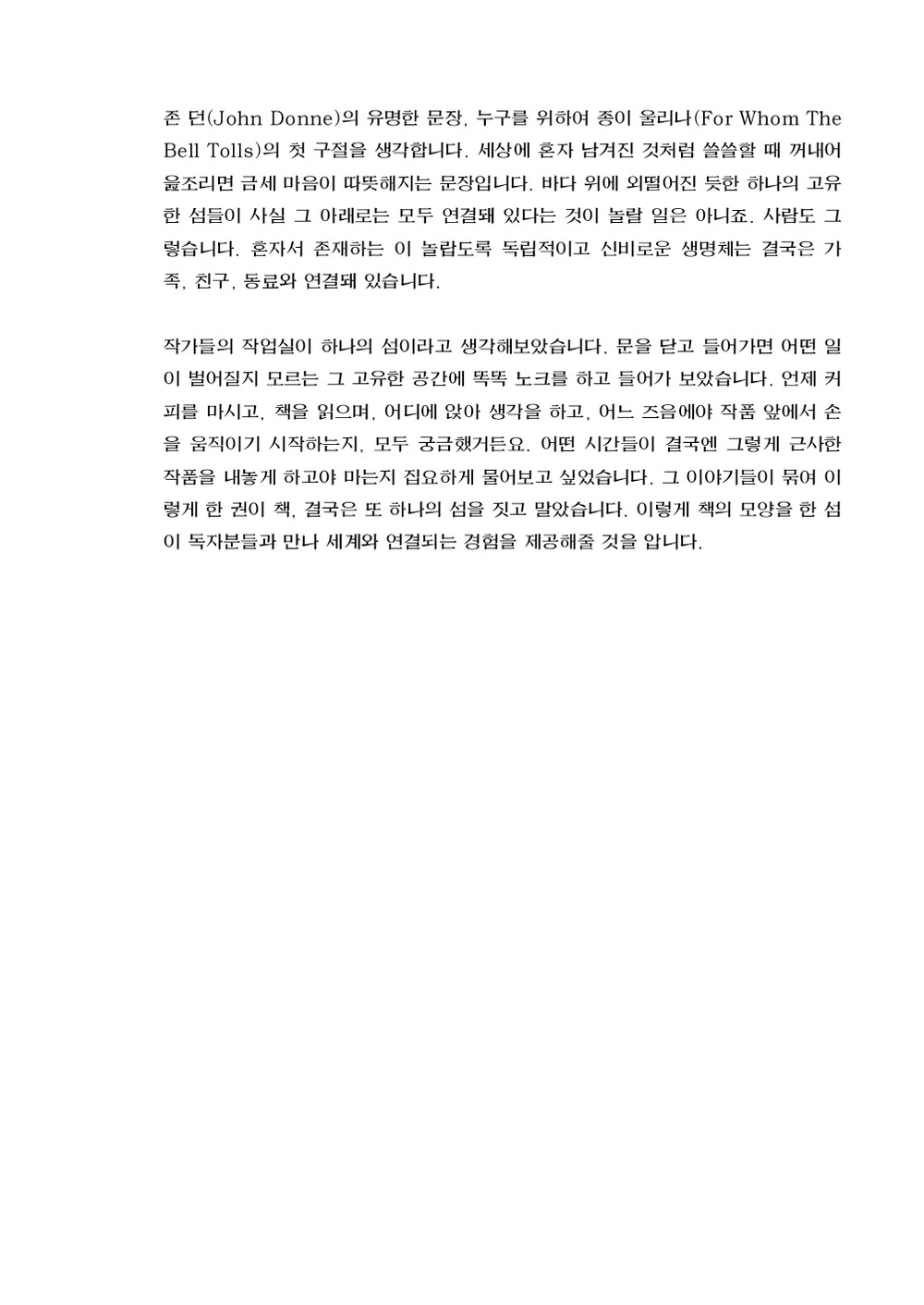 작가들의 작업실이 하나의 섬이라고 생각해보았습니다. 문을 닫고 들어가면 어떤 일이 벌어지는지 아무도 모르는 그 고유한 공간에 똑똑 노크를 하고 들어가 보았습니다. 언제 커피를 마시고, 책을 읽으며, 어디에 앉아 생각을 하고, 어느 즈음에야 작품 앞에서 손을 움직이기 시작하는지, 모두 궁금했거든요. 어떤 시간들이 결국엔 그렇게 근사한 작품을 내놓게 하고야 마는지 집요하게 물어보고 싶었습니다. 그 이야기들이 묶여 이렇게 한 권이 책, 결국은 또 하나의 섬을 짓고 말았습니다. 이렇게 책의 모양을 한 섬이 독자분들과 만나 세계와 연결되는 경험을 제공해줄 것을 압니다.