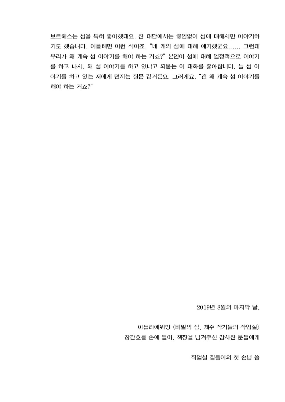 보르헤스는 섬을 특히 좋아했대요. 한 대담에서는 끊임없이 섬에 대해서만 이야기하기도 했습니다. 이를테면 이런 식이죠. “네 개의 섬에 대해 얘기했군요...... 그런데 우리가 왜 계속 섬 이야기를 해야 하는 거죠?” 본인이 섬에 대해 열정적으로 이야기를 하고 나서, 왜 섬 이야기를 하고 있냐고 되묻는 이 대화를 좋아합니다. 늘 섬 이야기를 하고 있는 저에게 던지는 질문 같거든요. 그러게요. “전 왜 계속 섬 이야기를 해야 하는 거죠?”
