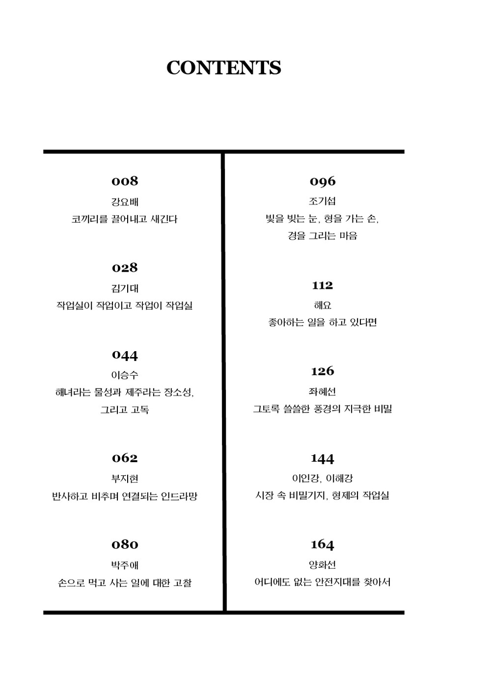 잘 다듬어지고 완성된 모습의 작품들을 보다가 작가의 생각들이 궁금해졌습니다. ‘작품을 만들어지는 과정에서의 작가는 어떤 모습일까', '어떤 고민과 생각을 가지고 작품을 만들어갈까’, 이러한 질문에서 이 책은 시작됐습니다. 창간호와 달리 2권은 디자인, 일러스트레이터, 생활예술, 문화운동 등 다양한 분야에서 활동하고 있는 사람들을 만나고 이야기를 나눴습니다.