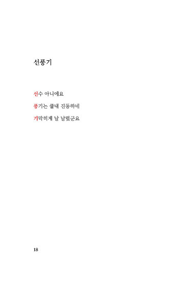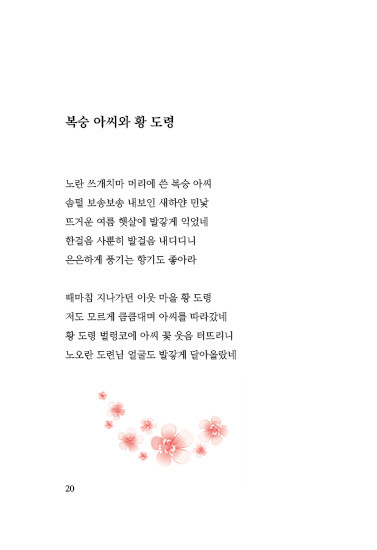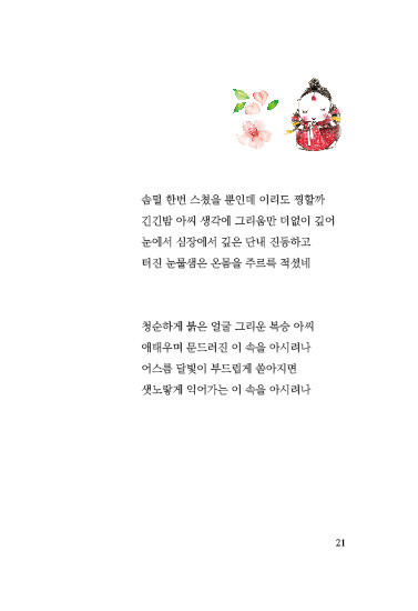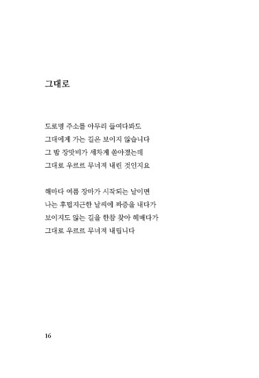 시집은 총200페이지로 다섯 개의 장으로 구성돼 있습니다. 각 장에는 사랑하는 이에 대한 그리움, 맛깔 나는 음식과 삶의 향기, 고단한 하루 끝 달콤한 휴식, 따뜻한 가족과 반려 동물의 이야기가 담겼습니다. 소박한 일상의 아름다운 이야기를 감각적인 자유시와 촌철살인 n행시로 만나 보세요.
