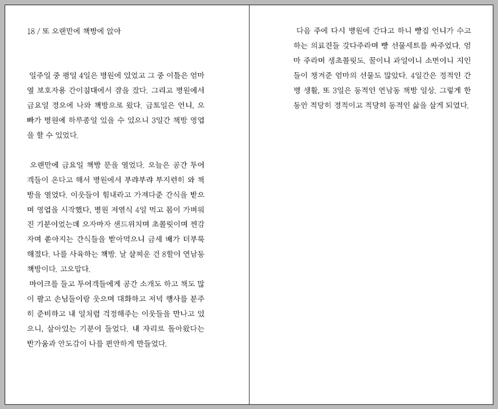 책방하면서 먹고살 만하냐고? 적게 쓰며 사는 건 가능한데 만약 큰돈이 들어갈 일이 생기거나 내가 책방을 못 나가게 되면 어떡하지? 내가 아프면? 엄마가 아프면? 항상 걱정하면서도 구체적인 대책이 없었는데 어느 날 갑자기 엄마가 쓰러졌다. -110 x 180mm -216페이지 -10,000원