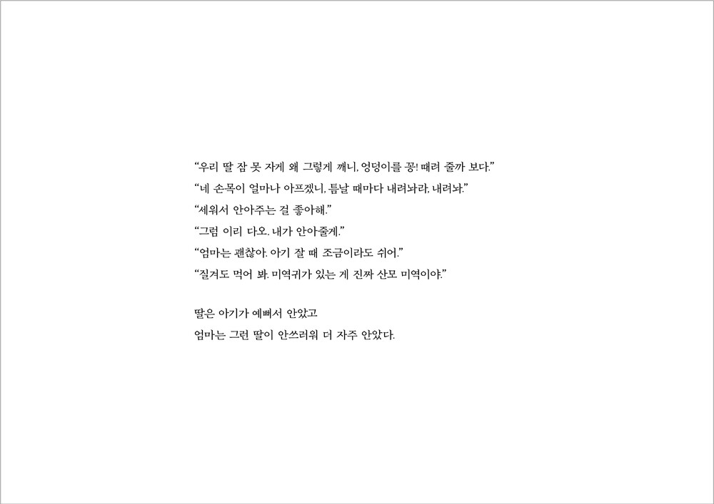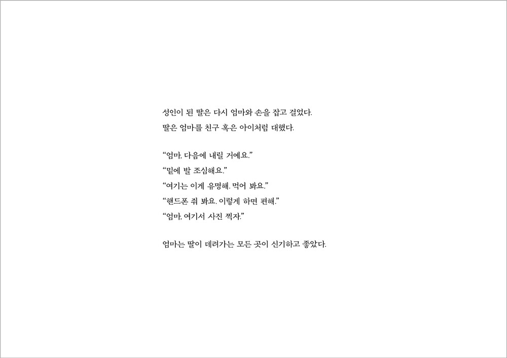 주변 사람들은 제가 첫아이를 낳은 후에 아이에 대한 책을 쓸 거로 생각했지만, 저는 엄마에 대한 글이 쓰고 싶어졌습니다. 아이를 키우는 것은 지금의 나와 그때의 엄마를 겹쳐보는 과정이었으니까요. 누군가를 진심으로 이해하는데 이보다 치열하고 강렬한 경험이 또 있을까요 .
