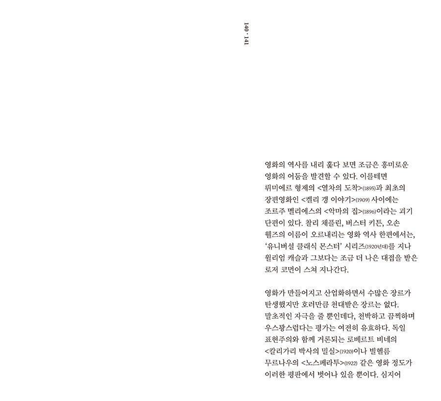 영화 역사의 시작부터 오늘날에 이르기까지 호러 장르는 밝은 영화 세계를 대표한 적이 없다. 그러나 가장 다양한 세계를 일구어냈다. 인간이 쌓아 올린 문화와 감정을 가장 순수하고 직접적으로 표현하면서 말이다."