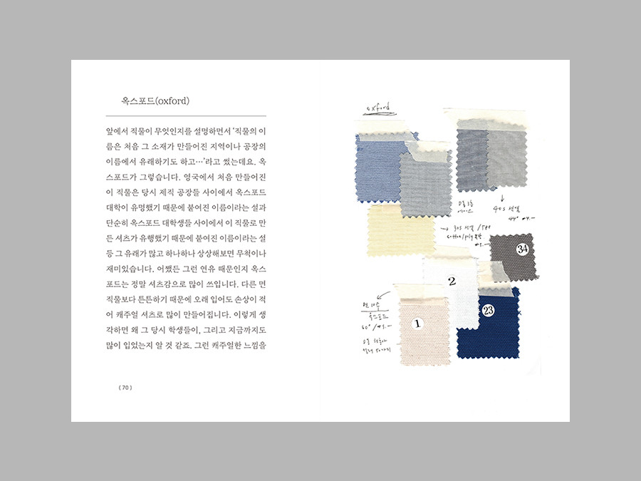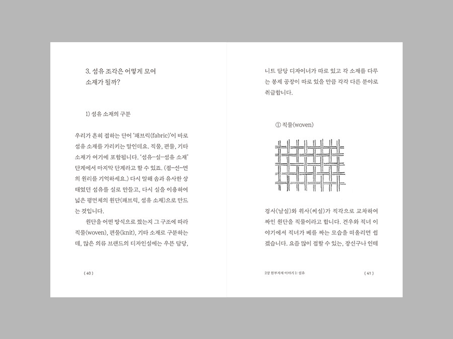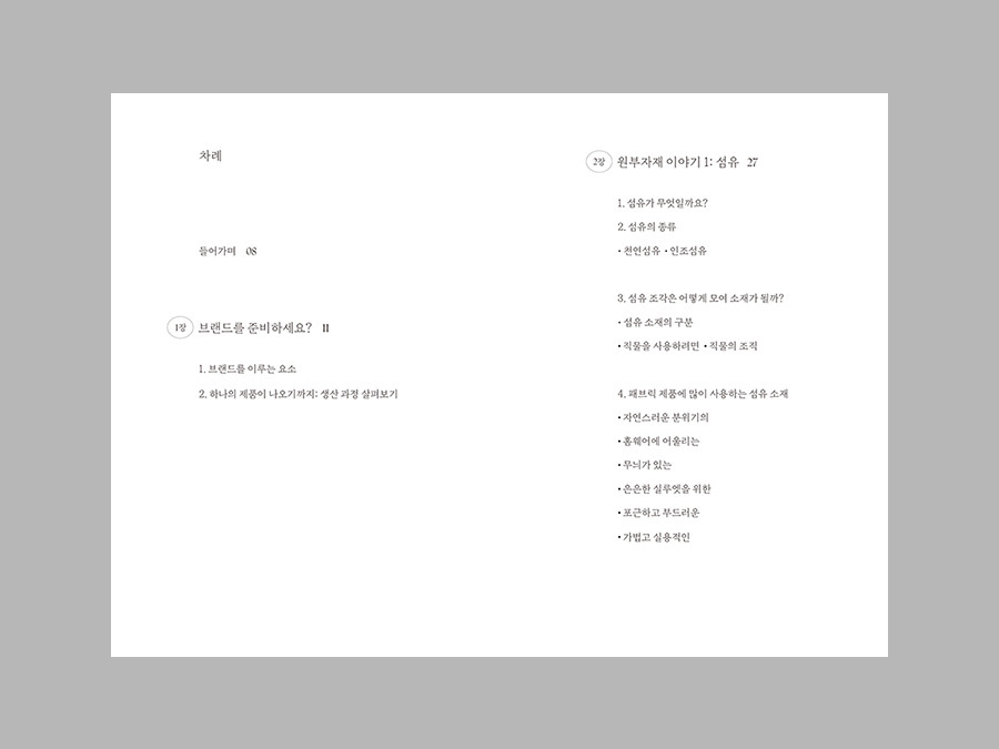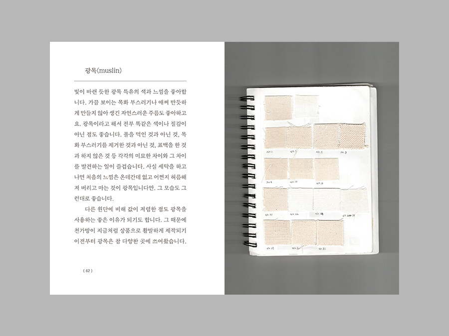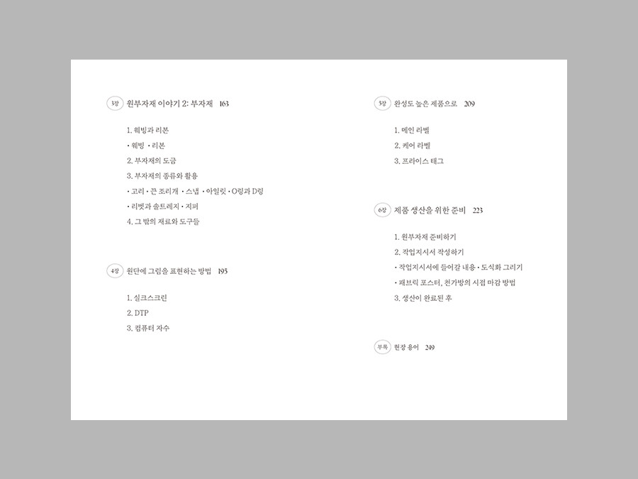 원단과 부자재 선택, 실크스크린이나 자수와 같은 후가공, 라벨 제작, 공장에 생산 의뢰를 위한 준비까지 하나의 제품을 만드는데 제작자가 겪는 일련의 과정을 이야기합니다.