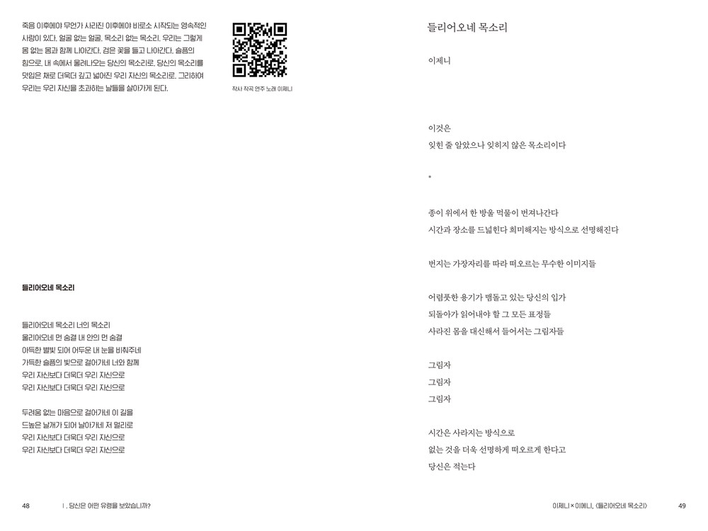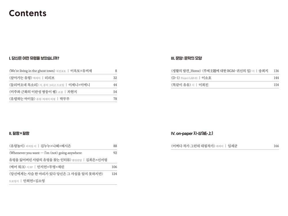 Ⅰ. 당신은 어떤 유령을 보았습니까? <We're living in the ghost town> 픽션포토______이옥토X유비채 <살아가는 유령> 에세이_______리리브 <들리어오네 목소리> 시, 음악 그리고 드로잉______이제니X이에니 <미주와 근화의 이란성 쌍둥이 썰> 소설______차현지 <유령하는 아이들> 유령-에세이 비평______박무무