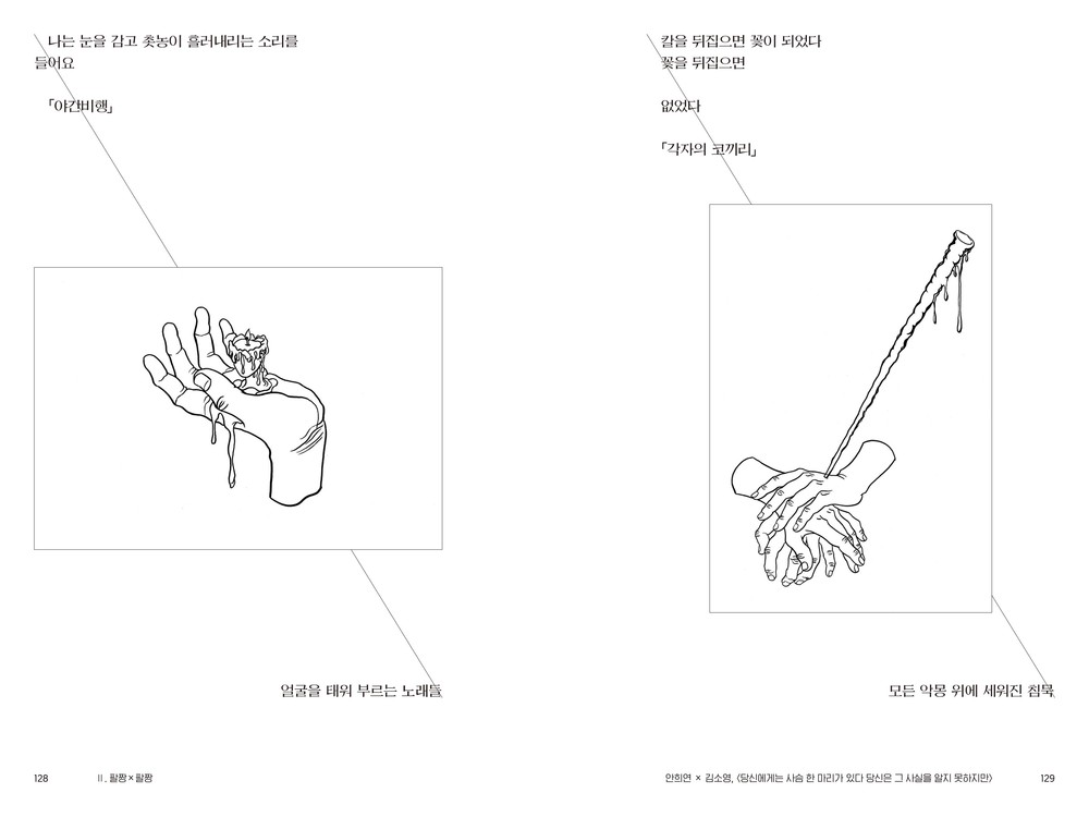 2부 [팔짱X팔짱]에는 장르와 장르의 충돌, 사람과 사람의 협업이 만들어낸 시너지가 가득 담겨있습니다. 세 명의 시인(김누누X나혜X배시은)이 음악 장르 속 피처링 방식을 통해 직조해나가는 시, 유령을 찾으려는 사람과 떠나간 유령 사이를 맴도는 김희은X신서령 작가의 환상문답, 시-음악-이미지가 결합된 두 개의 트랙을 분해하고 재조립해 탄생한 세 개의 새로운 트랙으로 이루어진 안지연X투명X채린 작가의 시 EP 앨범, 문장이 그려낸 그림이 다시 문장을 그려내는 안희연X김소 작가의 드로잉시 등 신선한 시도로 이루어진 작품들을 만나보실 수 있습니다.