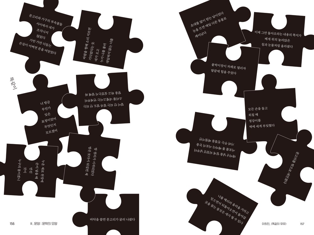 3부 [문양: 문학의 모양]에서는 문학의 모양과 형식을 뒤트는 실험작들을 만나보실 수 있습니다. 시 속 자아와 세계를 도형의 형태로 은유한 송희지 작가의 시, 부재를 겪는 가족 서사를 독특한 흐름으로 그려낸 이소호 작가의 Project LAB 03, 문장이 담긴 퍼즐 조각을 흩트려 보는 이희진 작가의 시 등 선형적인 읽기를 탈피하는 자유를 선사하는 작품들이 실렸습니다.