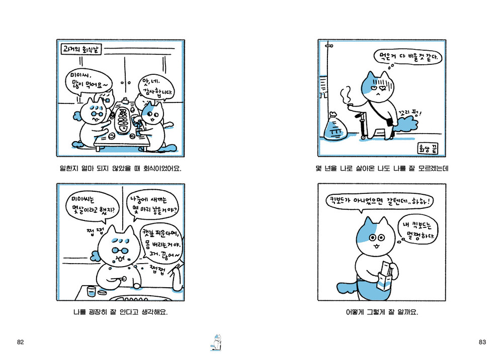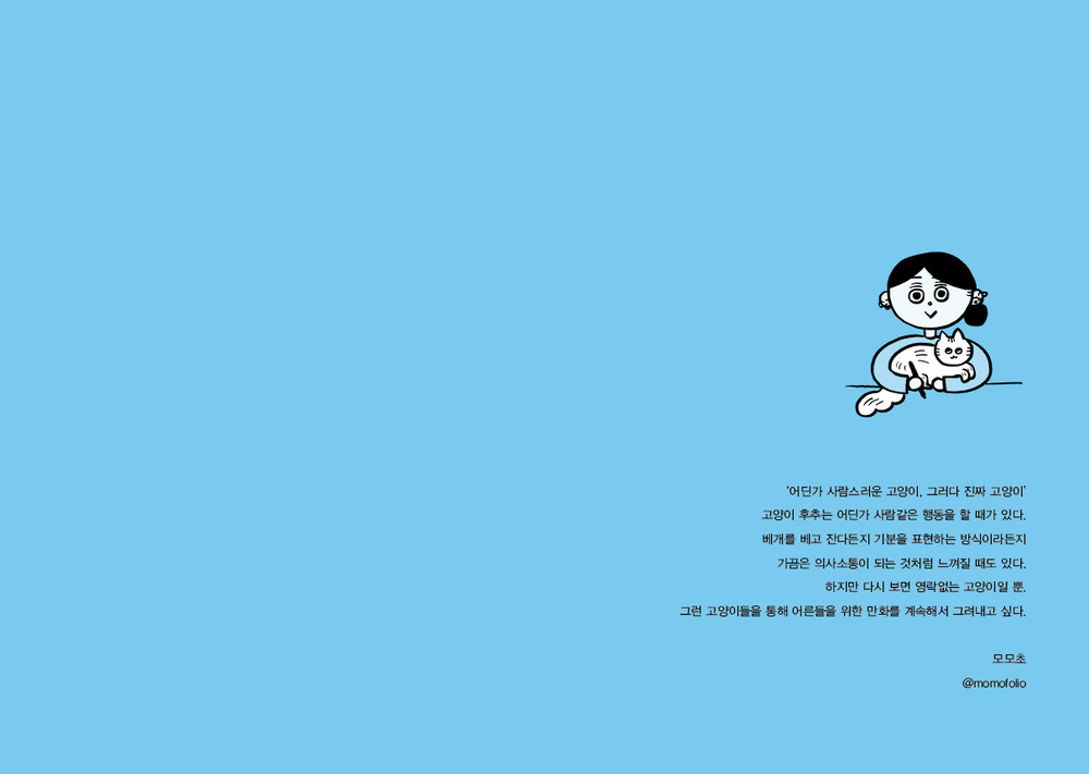 고양이 후추는 어딘가 사람같은 행동을 할 때가 있다. 베개를 베고 잔다든지 기분을 표현하는 방식이라든지 가끔은 의사소통이 되는 것처럼 느껴질 때도 있다. 하지만 다시 보면 영락없는 고양이일 뿐. 그런 고양이들을 통해 어른들을 위한 만화를 계속해서 그려내고 싶다.