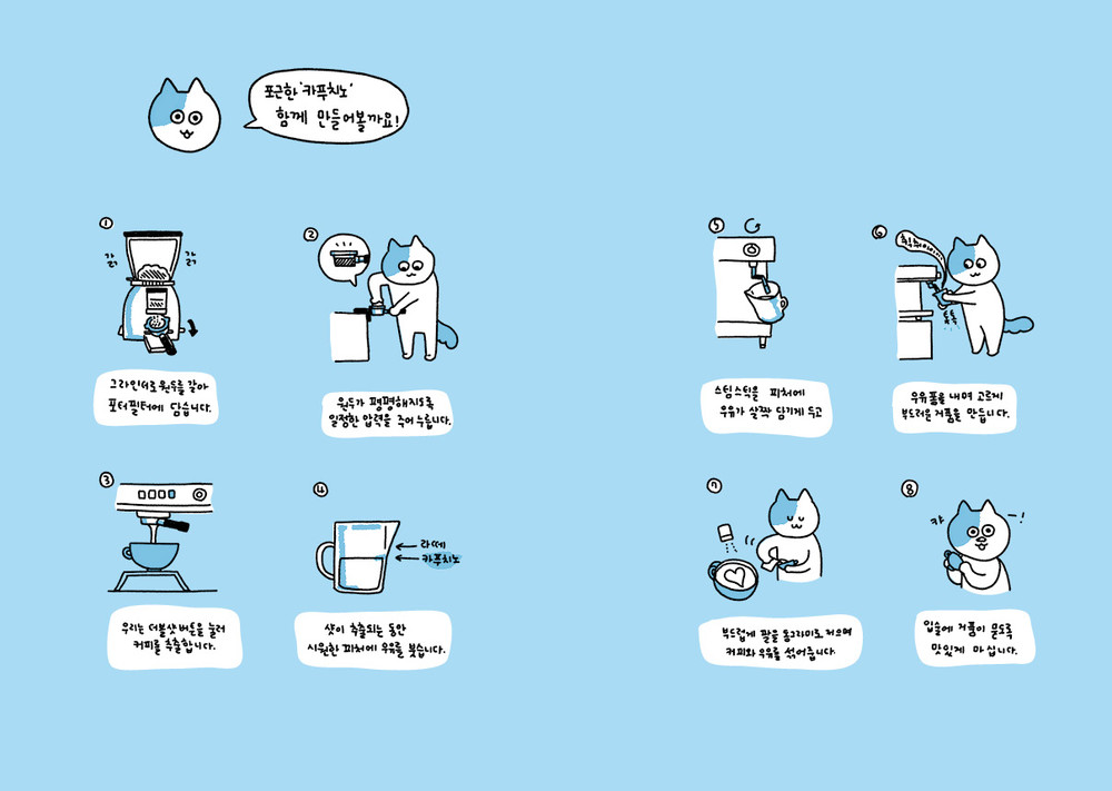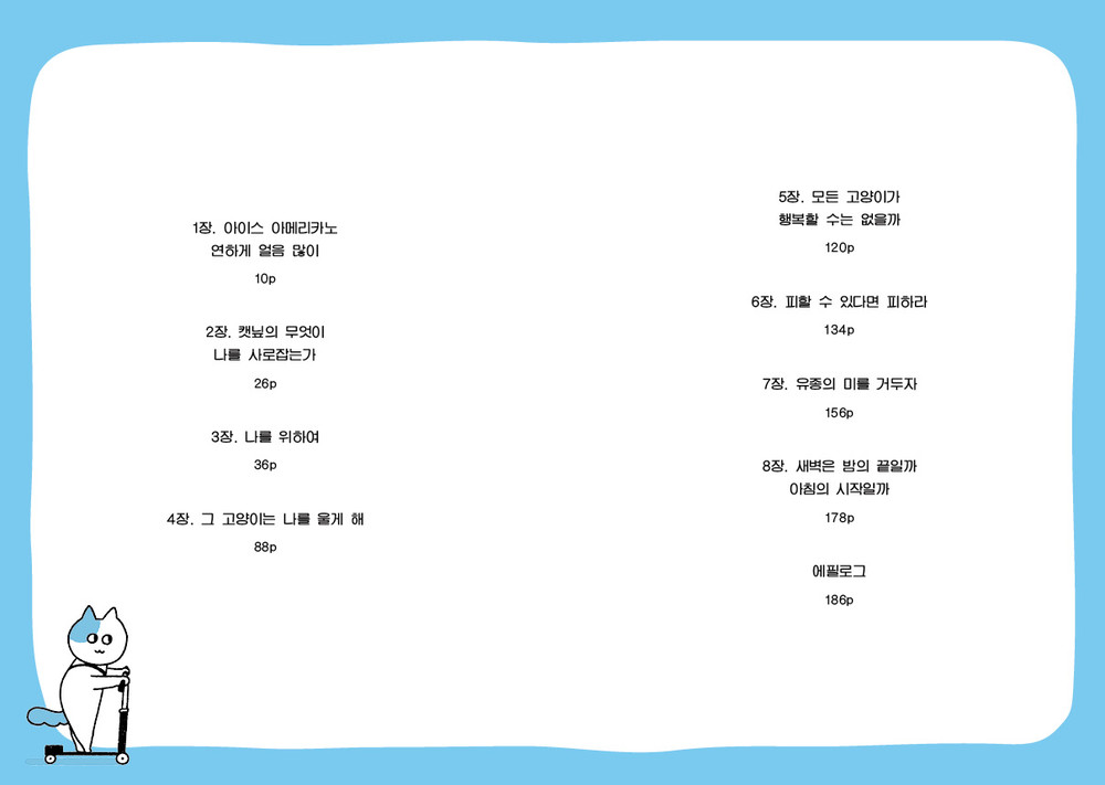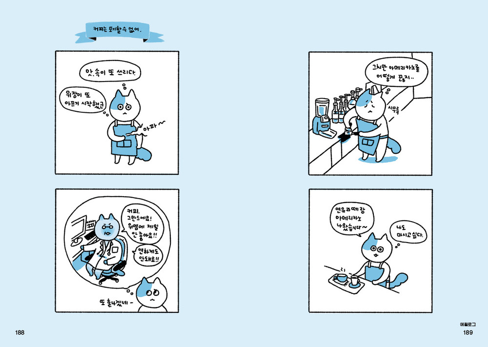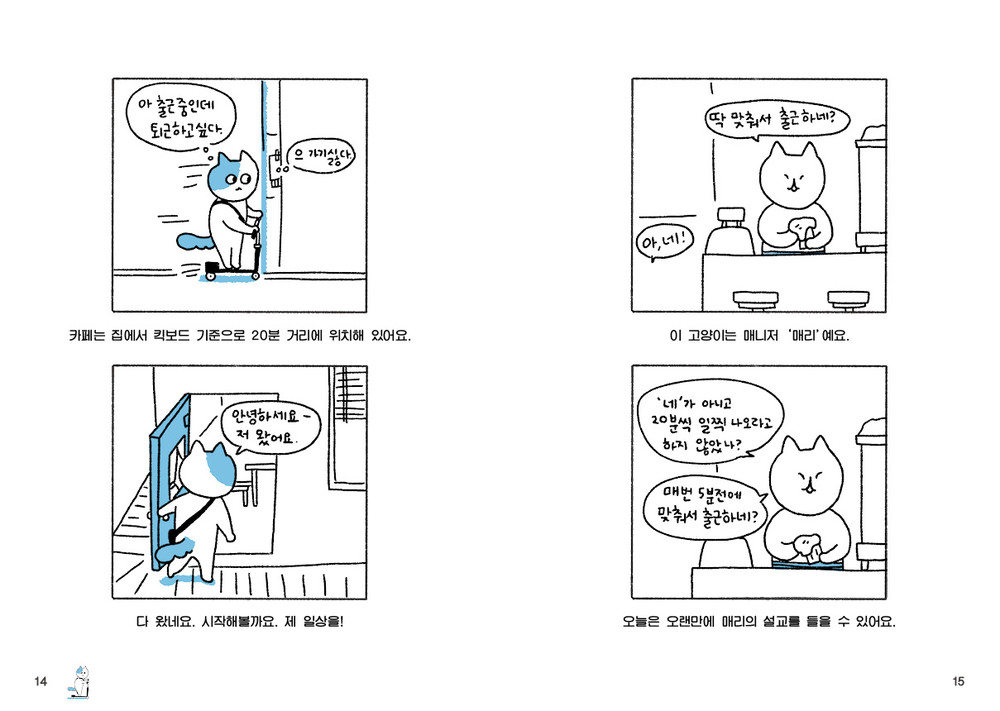 고양이 바리스타 미이는 킥보드를 타고 출근하고 힘겨운 날에는 캣닢을 피우고 카페 문을 닫고 친구와 둘만의 칵테일 바를 열기도 합니다. 그런데 미이만 보면 트집을 잡는 상사, 무례한 손님의 등장, 카페라는 공간은 휴식과 만남의 장소이지만 때로는 소소한 일상의 사건들이 벌어지는 무대가 되기도 합니다.