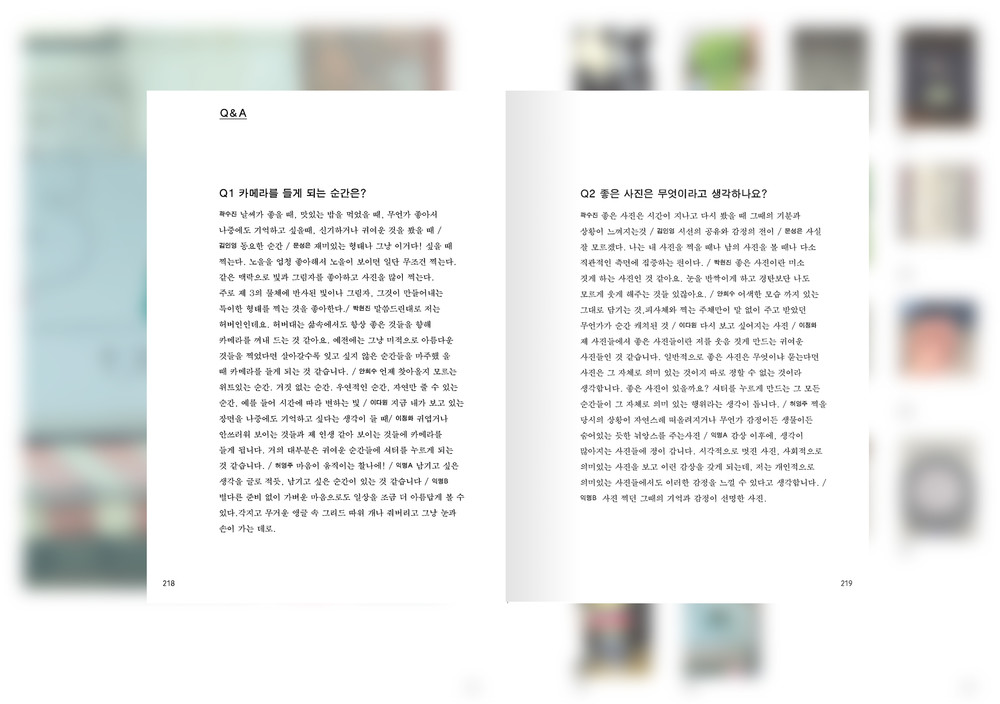 10명의 작업자의 사진 18장씩 총 180장의 사진과 각 사진에 대한 짧은 설명, 그리고 핸드폰 사진과 사진에 대한 그들의 생각