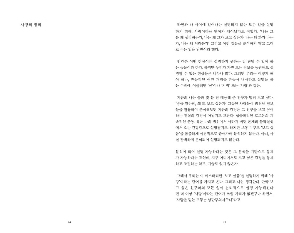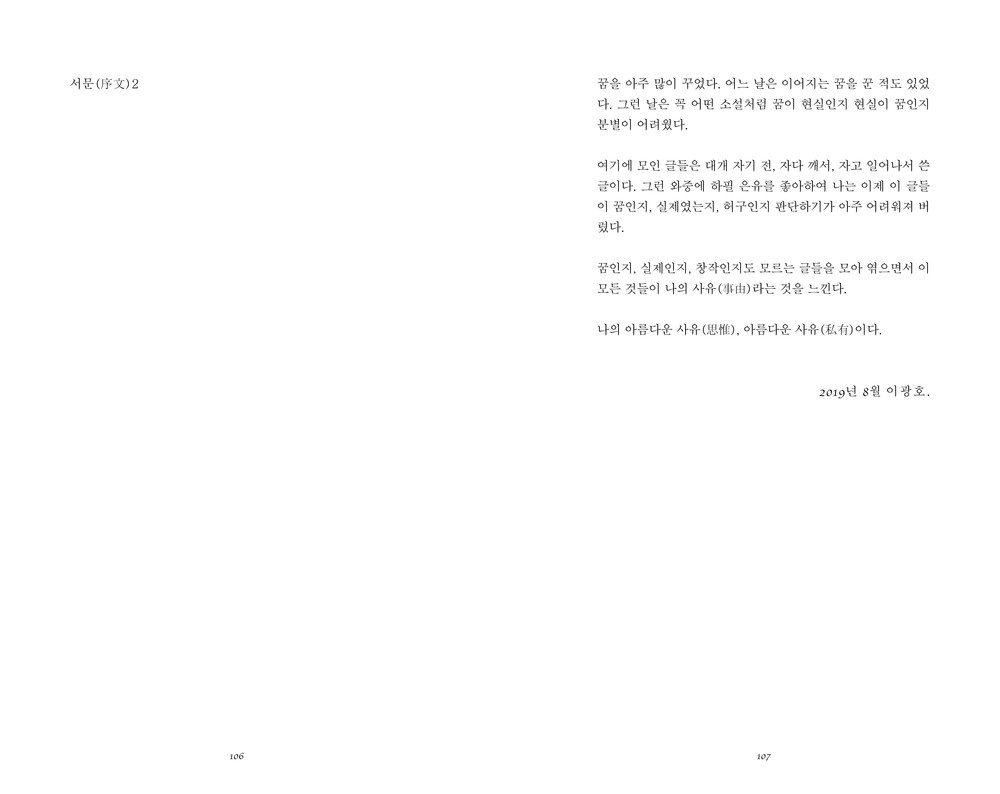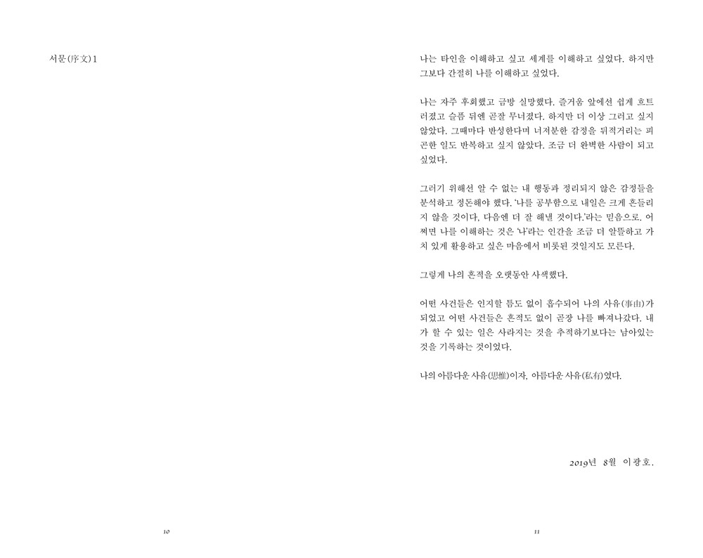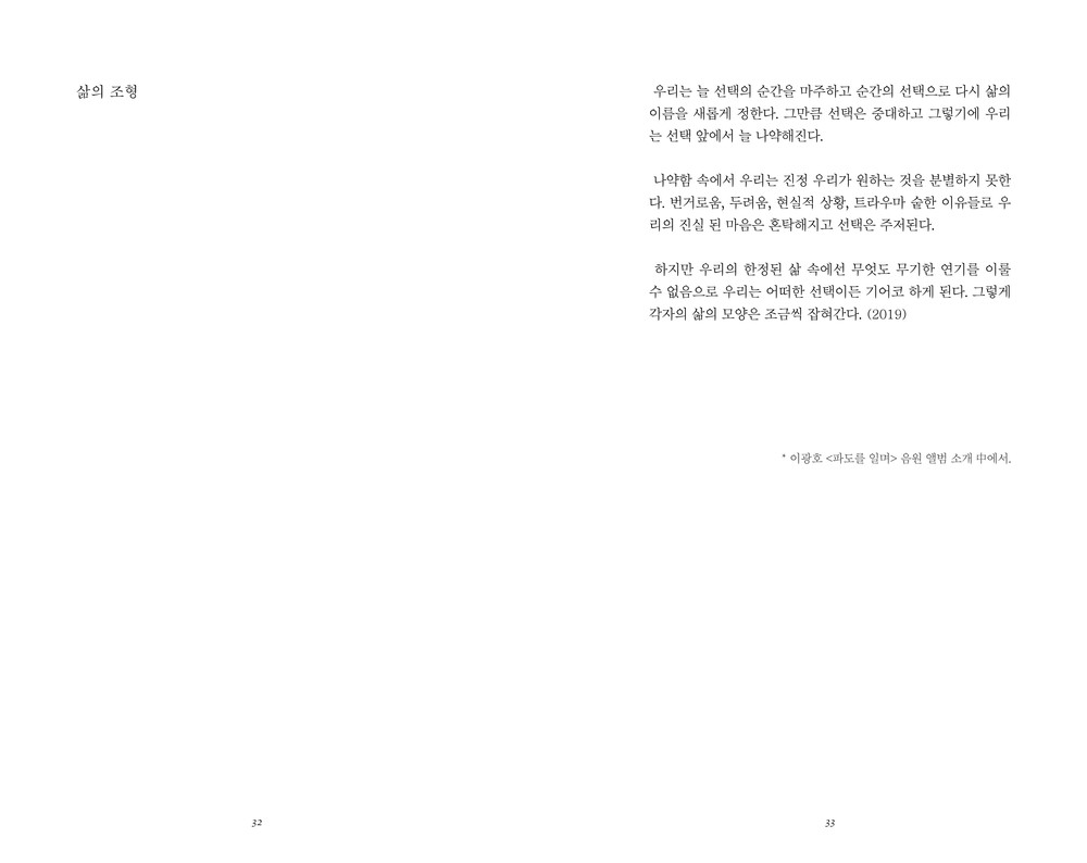 삶의 가치를 주는 유일한 것은 사랑, 좋아하는 것을 가까이 두는 일을 행복으로 여기는 이광호. 그의 삶과 생각, 예술을 정성스럽고 조밀하게 담았다. 이 한 권의 책이 많은 사람들의 생각과 마음을 맑게 정돈시켜 줄 수 있을거라 믿는다. 그러므로 우리는 평화를 만들어내고 기어코 우리 삶에 엮인 사람들과 더욱 기쁘고 아름답게 머물 수 있을 것이다.