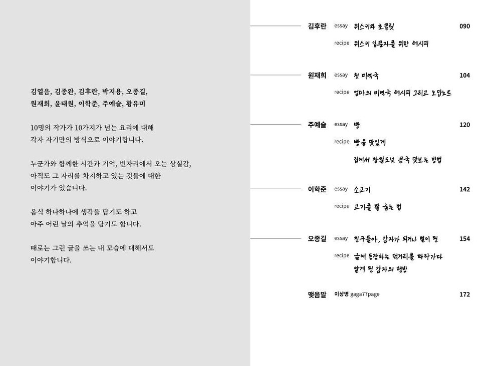 10명의 작가가 10가지가 넘는 요리에 대해 각자 자기만의 방식으로 이야기합니다.