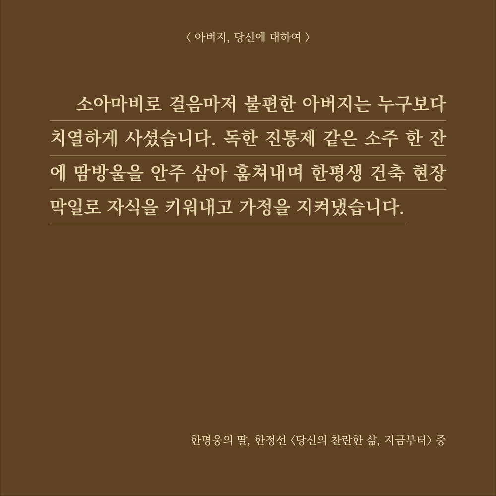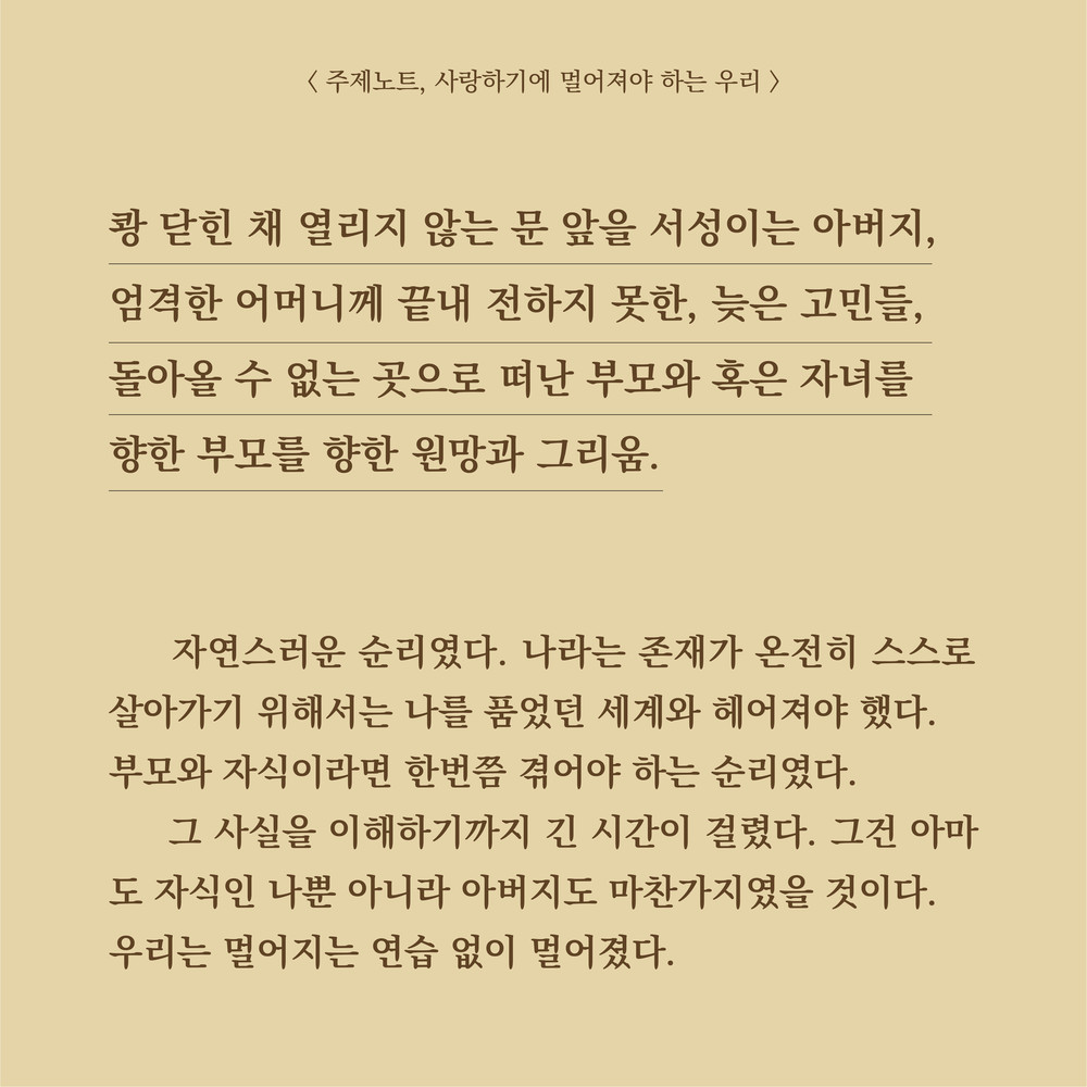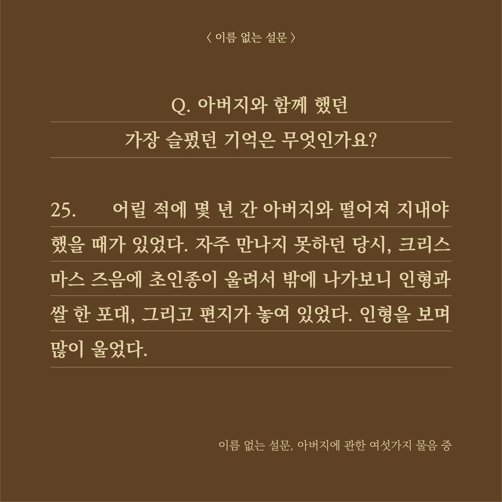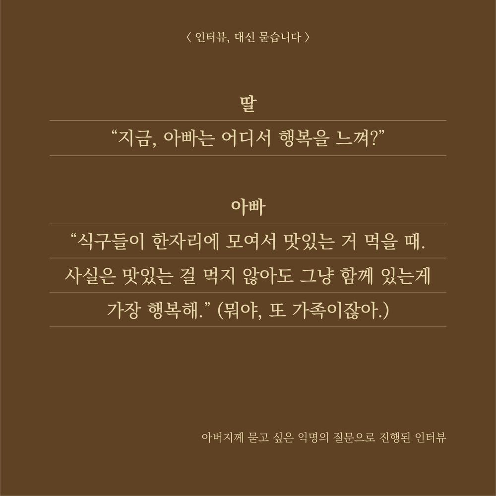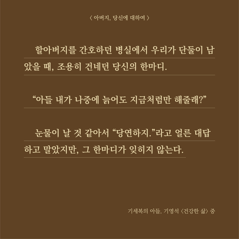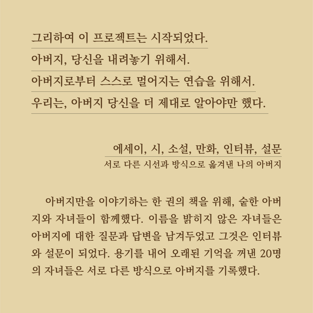 사랑하기 위해서 멀어져야만 했던 당신과 나 21명의 자녀들이 말하는 나의 아버지. 떠나왔다고 생각했을 때, 가까워지는 더는 필요 없다고 생각했을 때, 더욱 절실해지는 아버지, 당신을 이야기하기 위해 용기를 낸 21명의 자녀들. 에세이, 시, 소설, 만화, 인터뷰, 설문. 우리는 서로 다른 시선과 방식으로 아버지를 옮겨두었다. 여전히 서툴고 부족한 마음일 테지만 그 모두가 당신을 사랑하는 마음이라는 것을 이해해줄 당신을 알기에, 우리는 한 권의 이야기를 맺을 수 있었다. 책 <거울 같은 당신께 겨울 같던 우리가>는 문장과장면들의 비정기적 프로젝트 [이달의 장르]의 첫 단행본으로, 기획자 가랑비메이커와 독립출판 작가 기영석, 임나운, 박수진, 박지수, 주예슬 등을 비롯한 21명의 작가진이 함께 자유롭게 참여하였습니다.