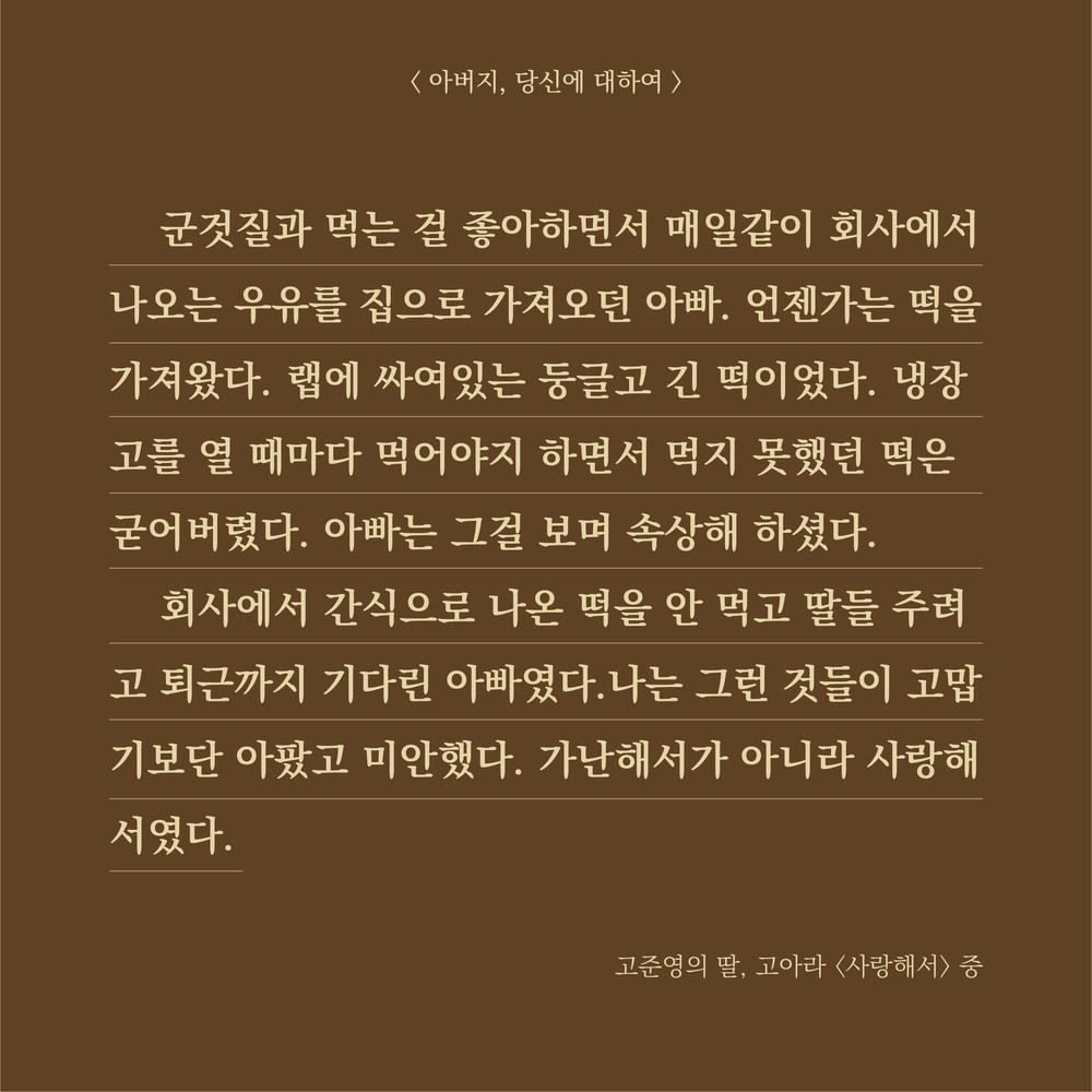 문장과장면들 대표, 가랑비메이커 고준영의 딸, 고애라 외 20명의 자녀들 어릴 적에는 아빠를 닮았다는 말에 울음을 터뜨렸지만, 이제는 거울 앞에서 마주하는 쓸쓸한 사내의 모습에 더욱 잘 살아가기로 다짐한다. 그럴듯한 이야기보다 삶으로 읽히기를 바란다. 낮고 고요한 공간과 평범한 사람들에 이끌린다. 단상집 시리즈 『지금, 여기를 놓친 채 그때, 거기를 말한들』, 『숱한 사람들 속을 헤집고 나왔어도』, 장면집 『언젠가 머물렀고 어느 틈에 놓쳐버린』, 고백집 『고요한 세계에 독백을 남길 때』 를 썼다. 책과 영화를 좋아하고 사진을 찍는 다. 이따금 다양한 사람들과 내밀한 이야기를 나누는 모임을 진행한다.