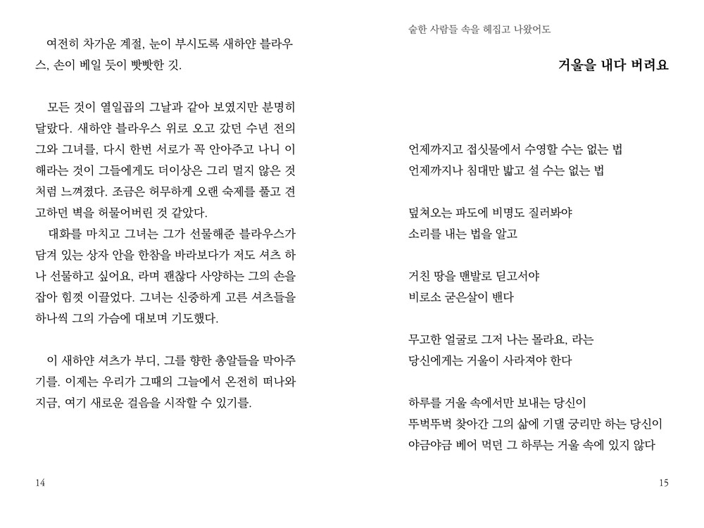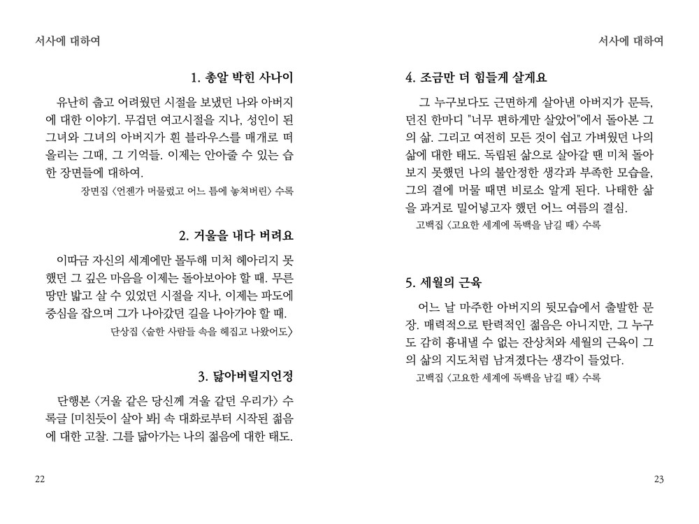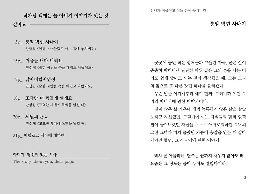 미니북 <아버지, 당신이 있는 서사> 중철제본 100*1500, 28p 정가 4,000 책 소개 단행본 <거울 같은 당신께 겨울 같던 우리가> 출간 기념 제작 미니 아카이빙북. "작가님, 책 속에는 늘 아버지가 있는 것 같아요." 라는 물음에서부터 출발했다. 아무런 의식 없이 써나간 글이었다. 온전히 나의 이야기라고 생각했는데, 작게 그늘진 자리에는 늘 아버지 당신이 있었다. 숱한 페이지들 사이에 숨죽여 자리를 지켜낸 아버지의 이야기만을 아카이빙했다. 손바닥만 한 세계에서만큼은 아버지, 당신만이 나의 서사가 된다. 목차 1 총알 받힌 사나이 - <언젠가 머물렀고 어느 틈에 놓쳐버린> 2 닳아버릴지언정 3 거울을 내다버려요 - <숱한 사람들 속을 헤집고 나왔어도> 중 4 조금만 더 힘들게 살게요 5 세월의 근육 -<고요한 세계에 독백을 남길 때> 6 에필로그