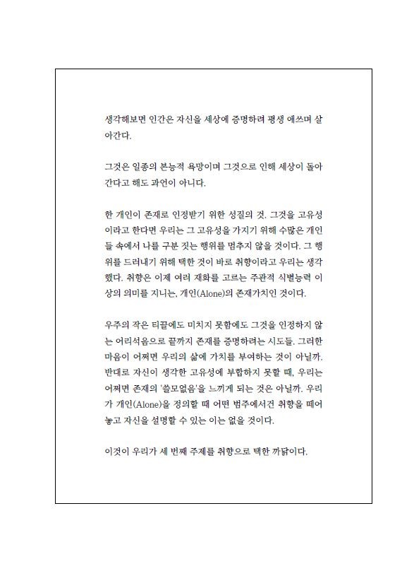 세 번째 결과물 <Alone am who i am> 은 '취향' 을 중심으로 '나' 를 설명하고 변주합니다.
