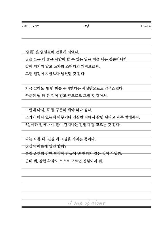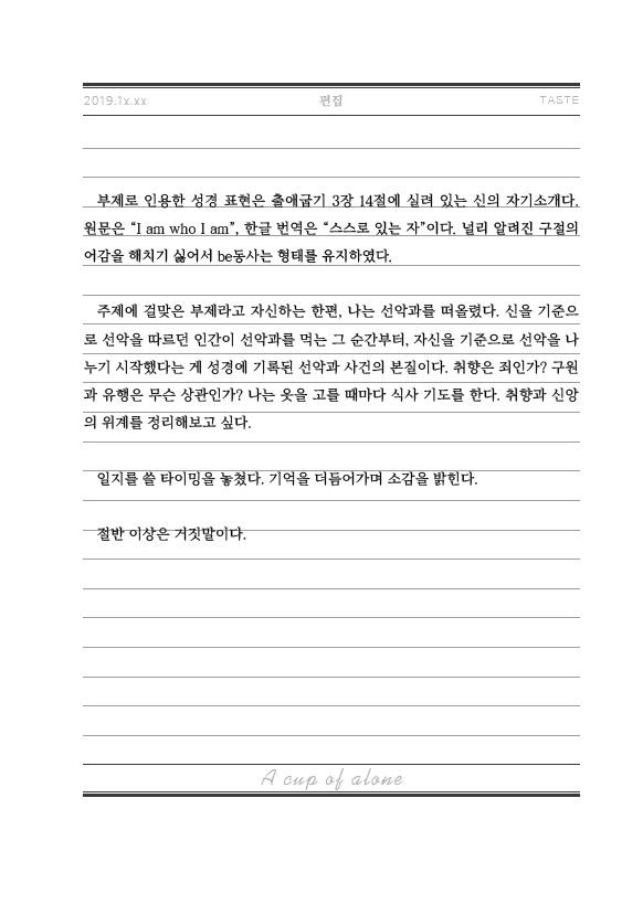 혼자를 위한 문예지를 표방하는《A1;one》(매거진얼론)은 '혼자' 일 수밖에 없는 '나' 에 주목하여, 수 많은 '나' 들의 이야기를 표현하고자 노력하는 독립문예지입니다.