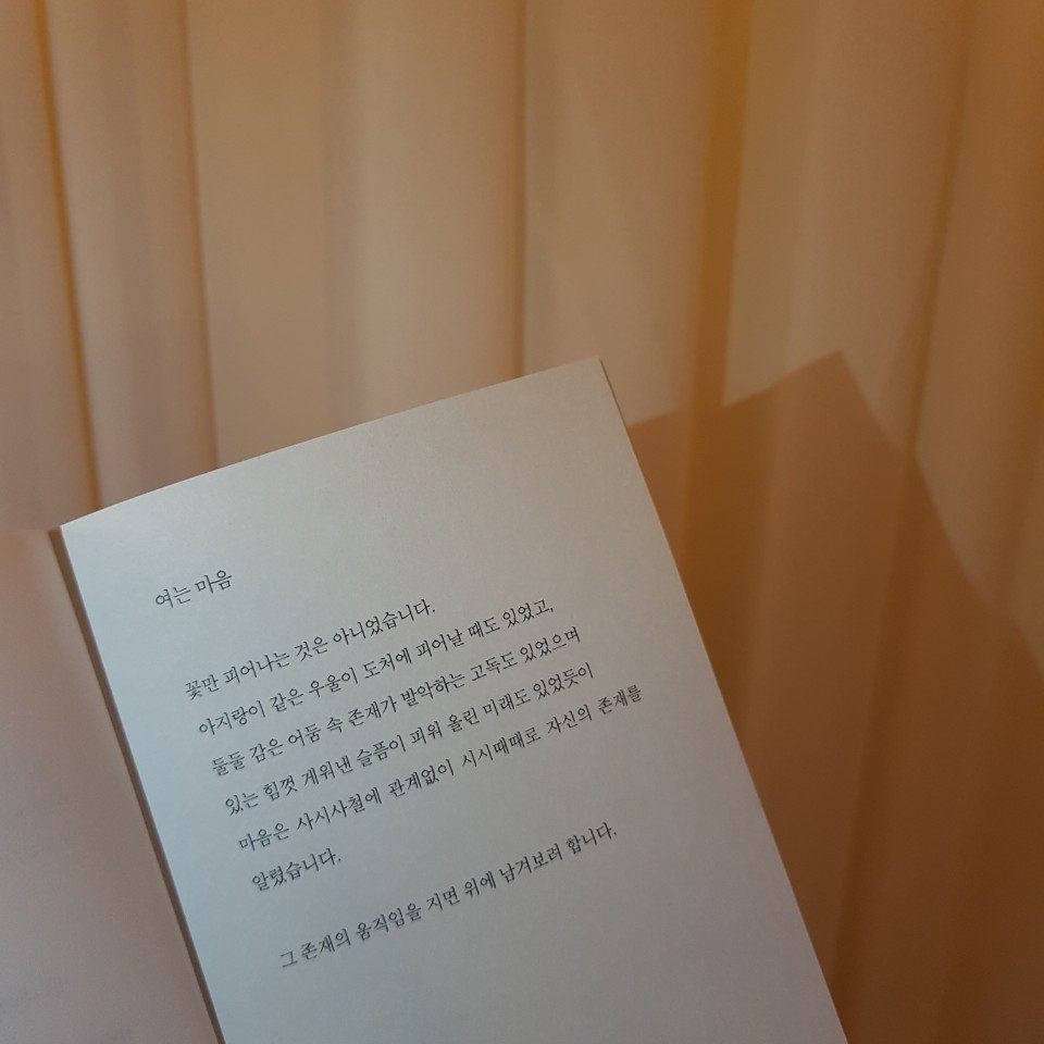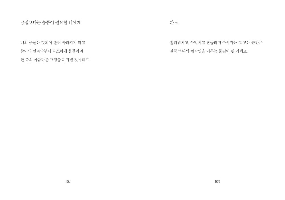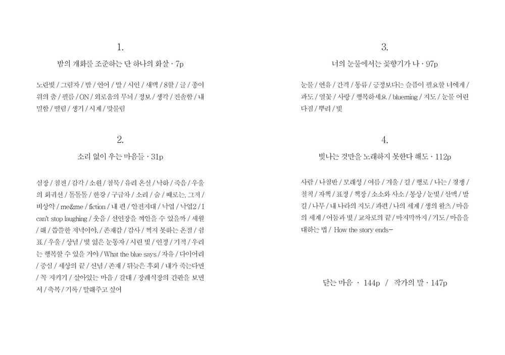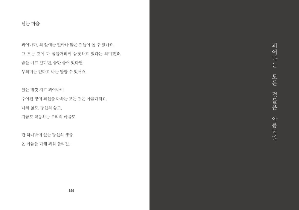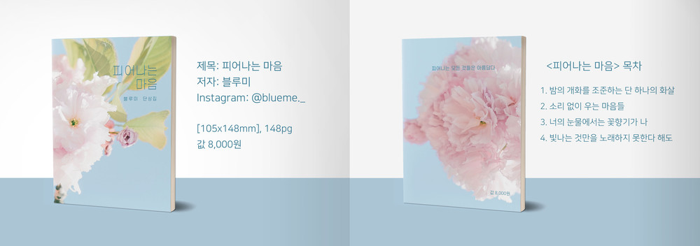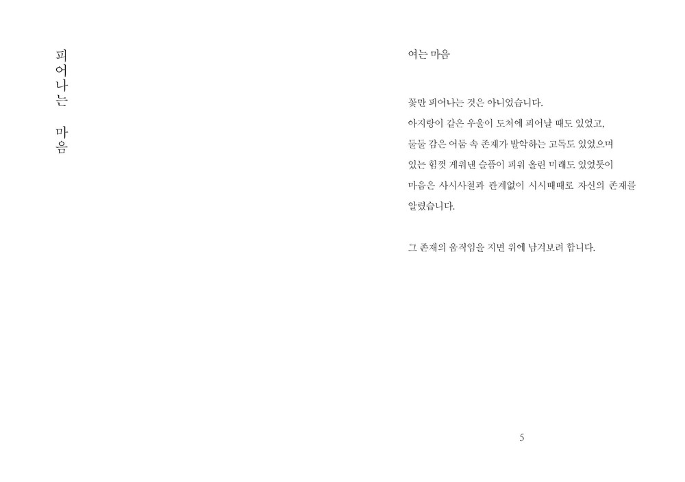 -소개: 꽃만 피어나는 것은 아니었습니다. 아지랑이 같은 우울이 도처에 피어날 때도 있었고, 둘둘 감은 어둠 손 존재가 발악하는 고독도 있었으며 있는 힘껏 게워낸 슬픔이 피워 올린 미래도 있었듯이 마음은 사시사철과 관계없이 시시때때로 자신의 존재를 알렸습니다. 꿈틀거리며 몸짓하는 그 존재의 움직임을 지면 위에 붙잡아 전하고 싶은 메시지와 함께 엮었습니다. 당신께도 그 메시지가 가닿을 수 있기를.