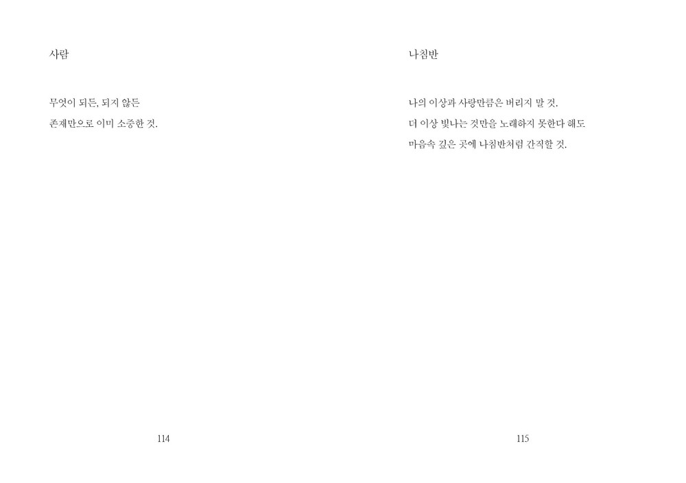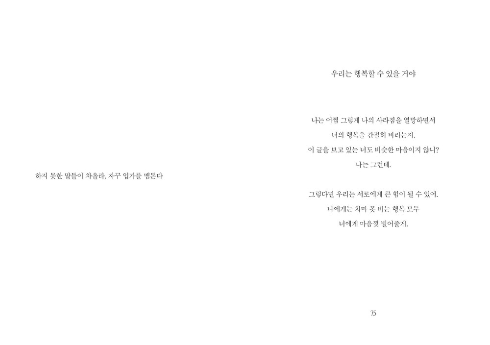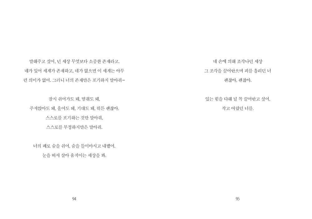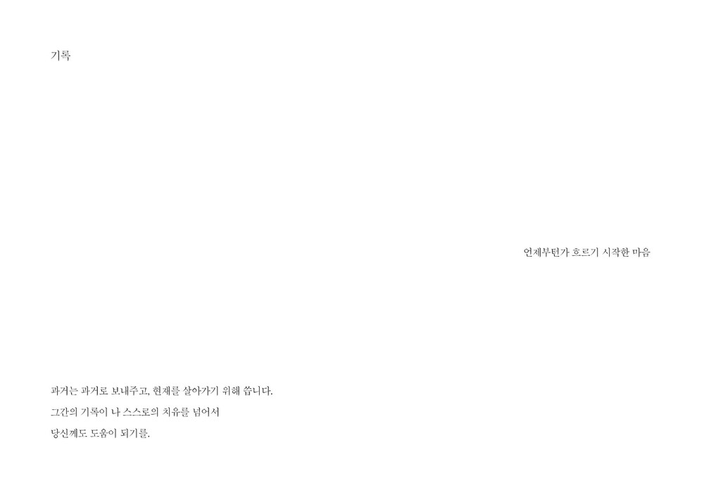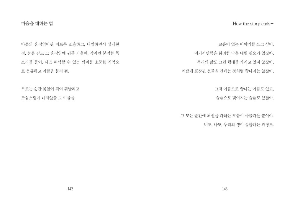 -소개: 꽃만 피어나는 것은 아니었습니다. 아지랑이 같은 우울이 도처에 피어날 때도 있었고, 둘둘 감은 어둠 손 존재가 발악하는 고독도 있었으며 있는 힘껏 게워낸 슬픔이 피워 올린 미래도 있었듯이 마음은 사시사철과 관계없이 시시때때로 자신의 존재를 알렸습니다. 꿈틀거리며 몸짓하는 그 존재의 움직임을 지면 위에 붙잡아 전하고 싶은 메시지와 함께 엮었습니다. 당신께도 그 메시지가 가닿을 수 있기를.